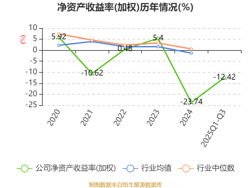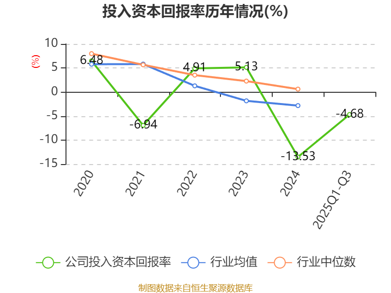 盈利能力方面, 2025年前三季度公司加权平均净资产收益率为-12.42%,同比下降2.05个百分点。公司2025年前三季度投入资本回报率为-4.68%,较上年同期上升1.19个百分点。