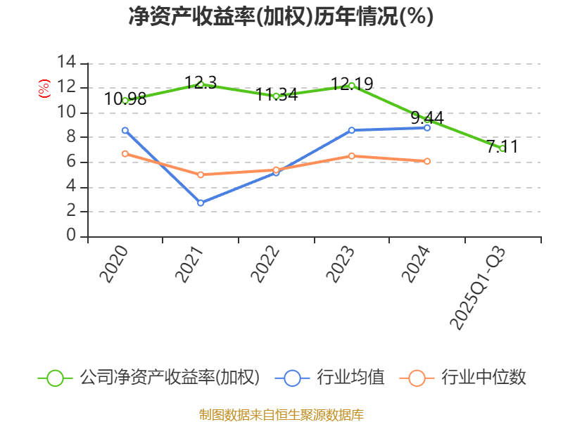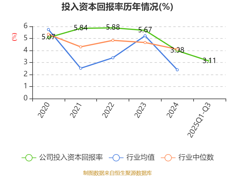 盈利能力方面, 2025年前三季度公司加权平均净资产收益率为7.11%,同比下降2.46个百分点。公司2025年前三季度投入资本回报率为3.11%,较上年同期下降0.89个百分点。