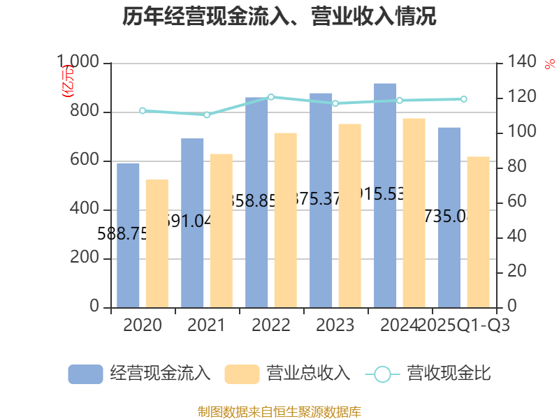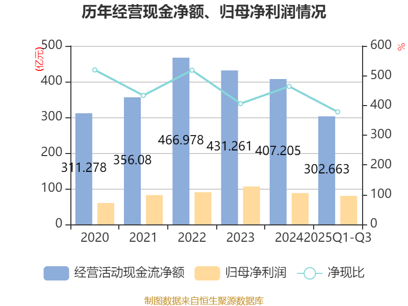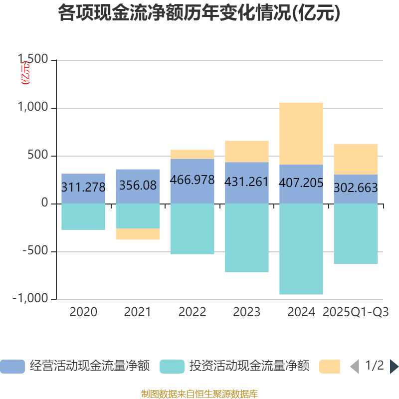 2025年前三季度,公司经营活动现金流净额为302.66亿元,同比下降7.85%;筹资活动现金流净额319.72亿元,同比增加34.34亿元;投资活动现金流净额-631.75亿元,上年同期为-614.86亿元。