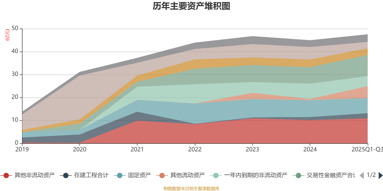 资产重大变化方面,截至2025年三季度末,公司其他流动资产较上年末增加888.82%,占公司总资产比重上升9.8个百分点;货币资金较上年末减少49.04%,占公司总资产比重下降6.26个百分点;一年内到期的非流动资产较上年末减少35.58%,占公司总资产比重下降5.82个百分点;交易性金融资产合计较上年末增加28.25%,占公司总资产比重上升3.41个百分点。