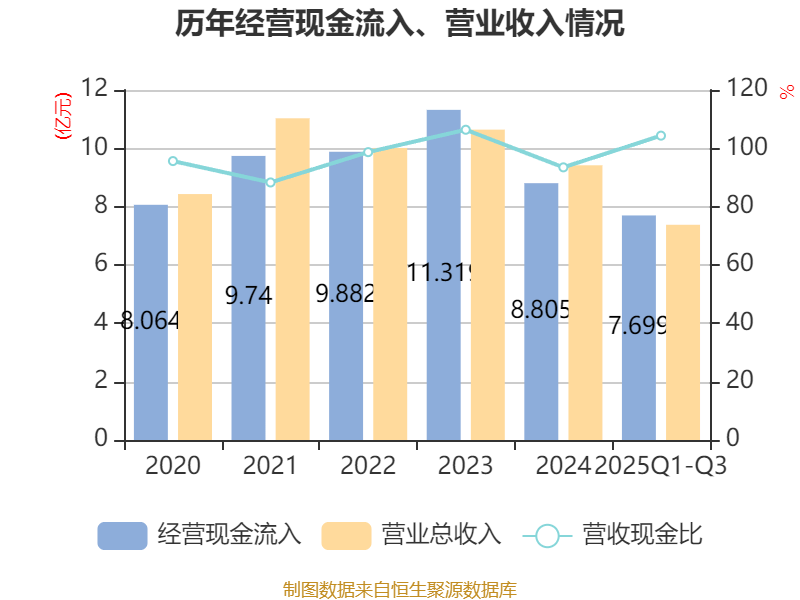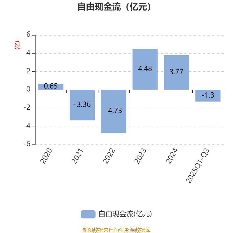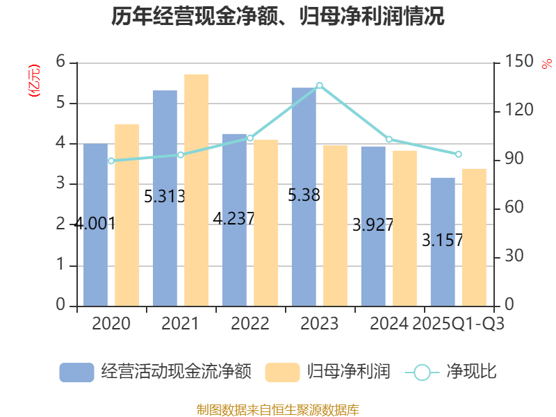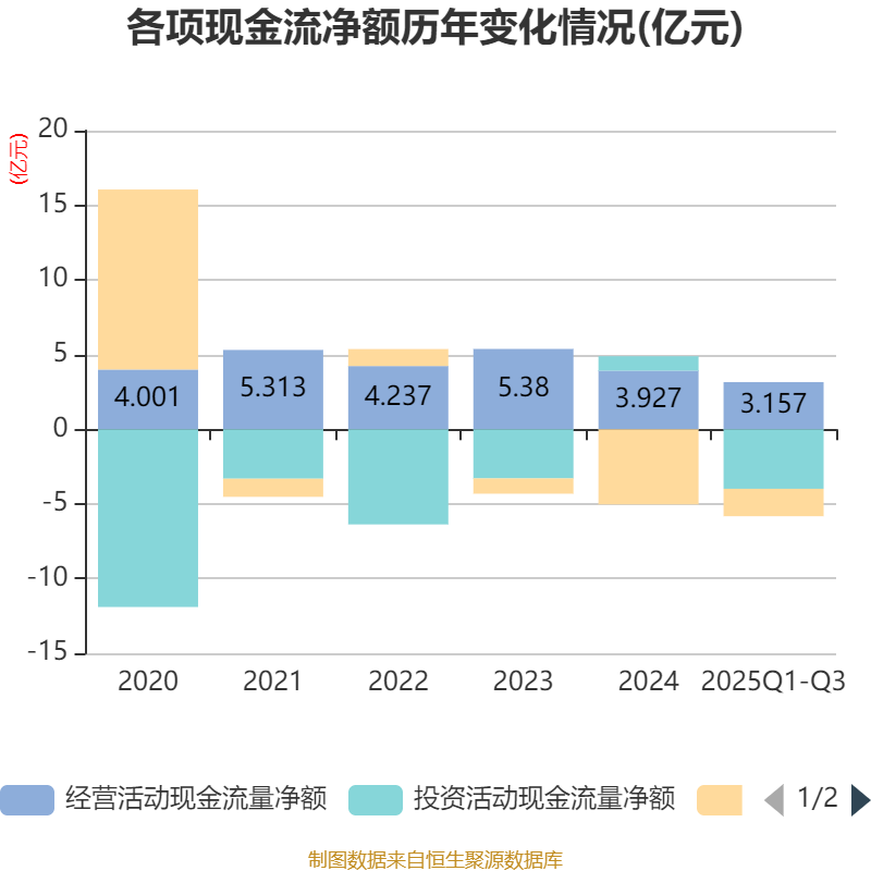 2025年前三季度,公司经营活动现金流净额为3.16亿元,同比增长15.61%;筹资活动现金流净额-1.84亿元,同比增加2.82亿元;投资活动现金流净额-3.99亿元,上年同期为2828.15万元。