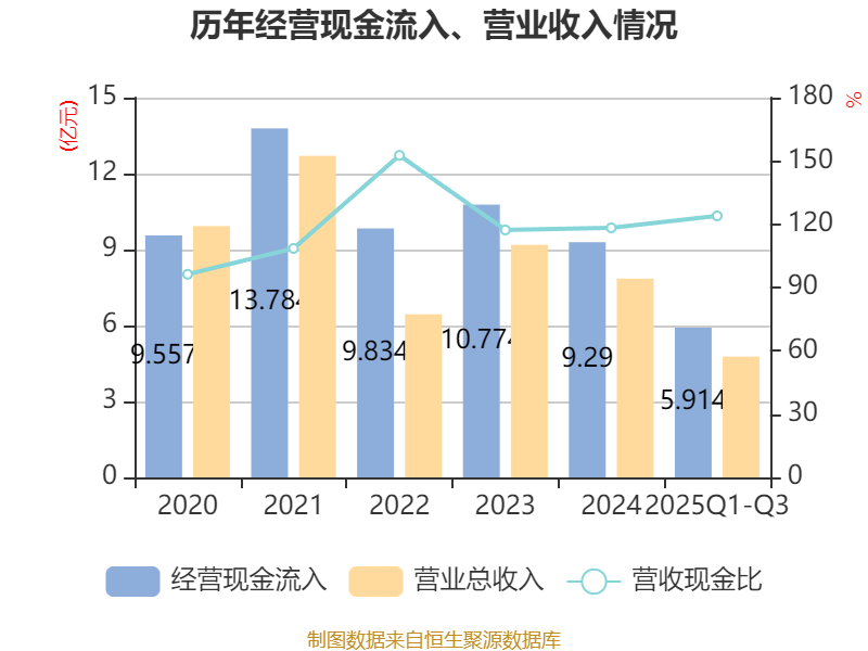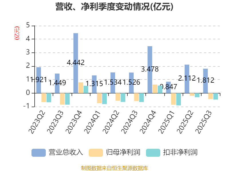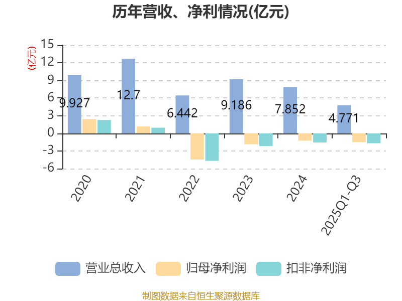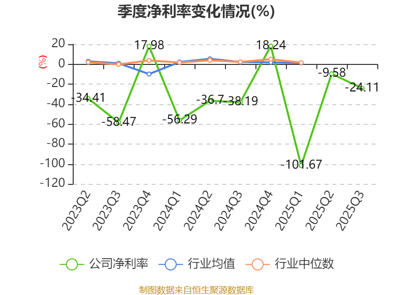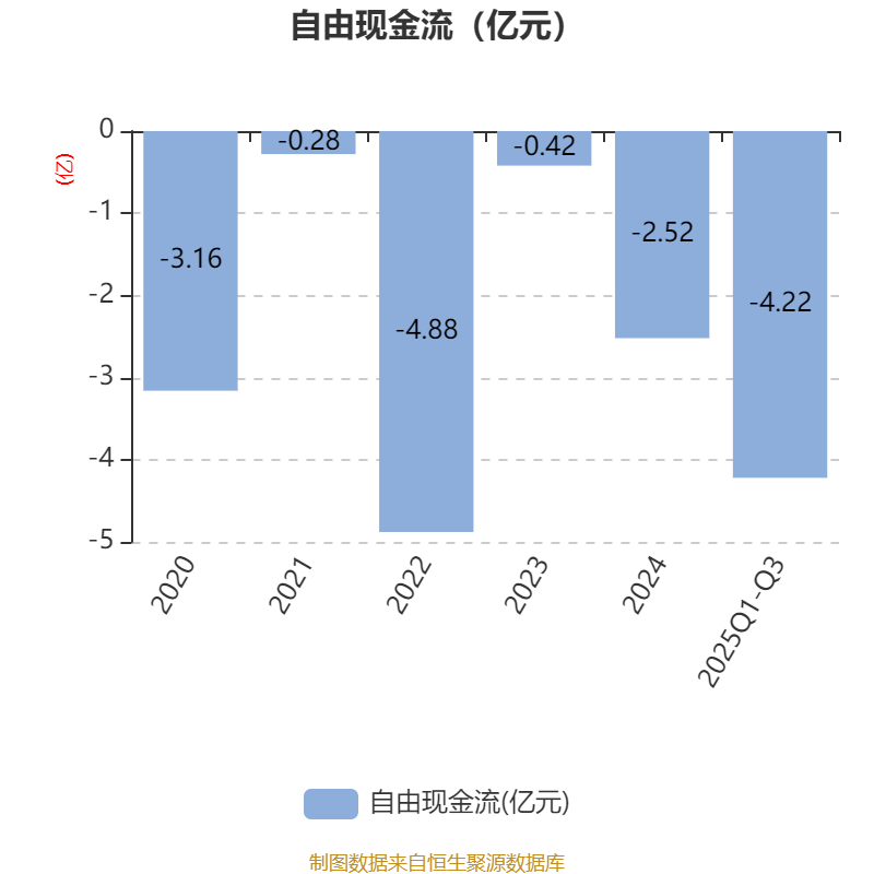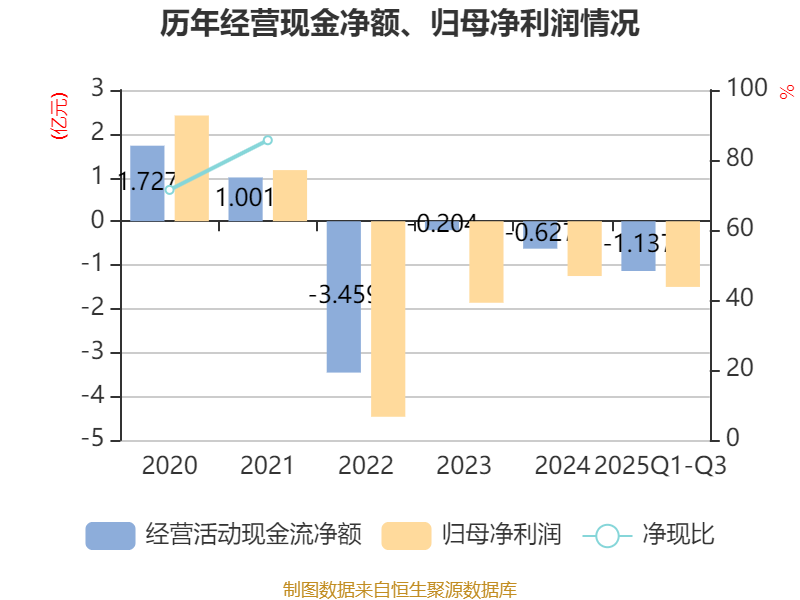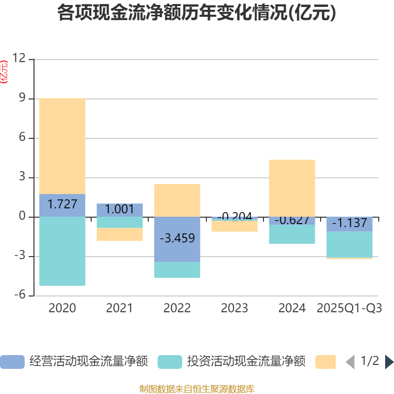 2025年前三季度,公司经营活动现金流净额为-1.14亿元,同比增加1.11亿元;筹资活动现金流净额-1025.05万元,同比减少4.2亿元;投资活动现金流净额-1.99亿元,上年同期为-3.37亿元。