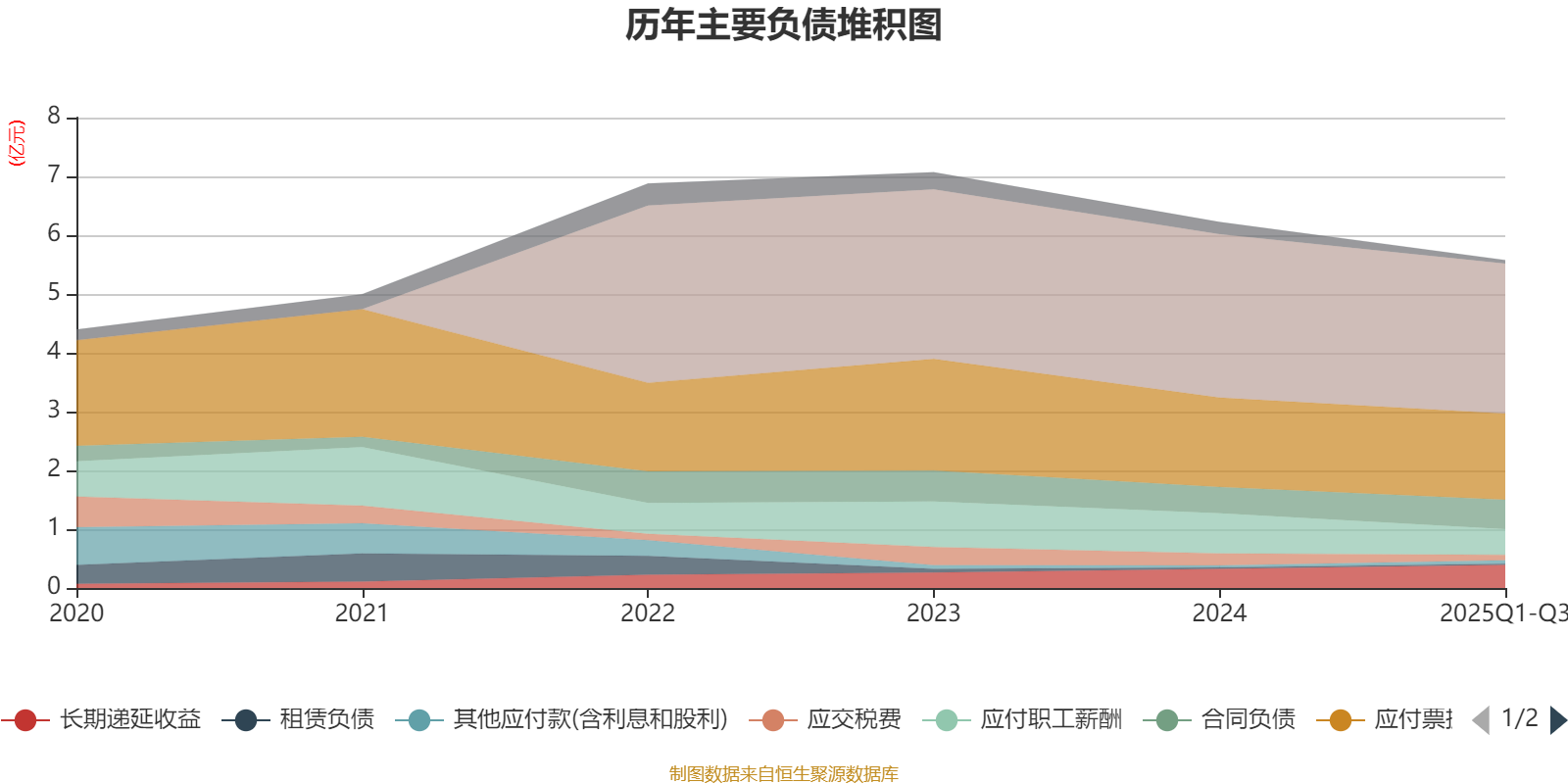 负债重大变化方面,截至2025年三季度末,公司应付职工薪酬较上年末减少35.8%,占公司总资产比重下降0.97个百分点;应付票据及应付账款较上年末减少3.63%,占公司总资产比重上升0.62个百分点;一年内到期的非流动负债较上年末减少78.75%,占公司总资产比重下降0.62个百分点;长期递延收益较上年末增加20.84%,占公司总资产比重上升0.59个百分点。