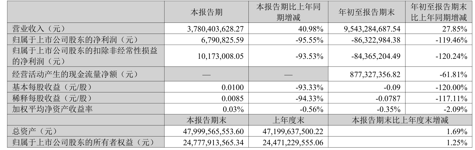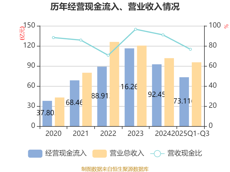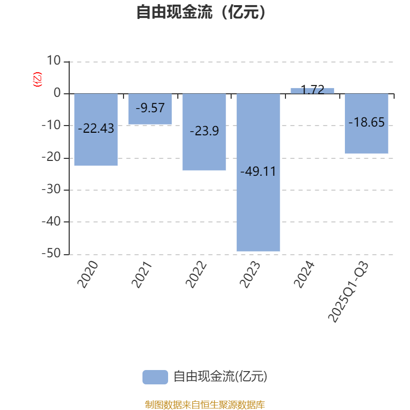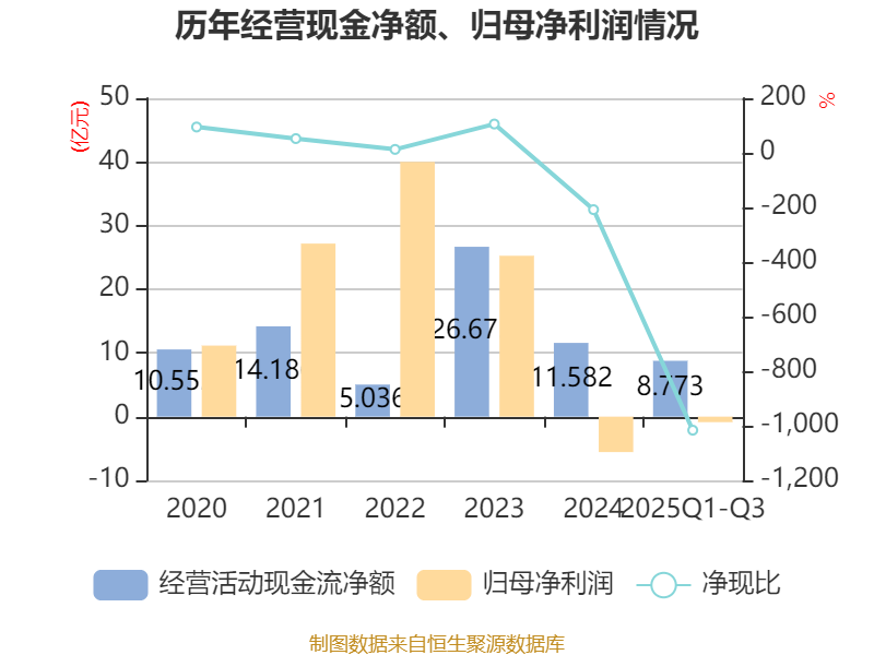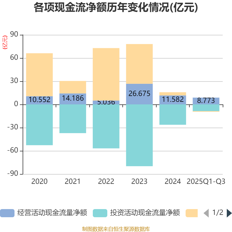 2025年前三季度,公司经营活动现金流净额为8.77亿元,同比下降61.81%;筹资活动现金流净额-9005.61万元,同比减少19.59亿元;投资活动现金流净额-8.63亿元,上年同期为-50亿元。