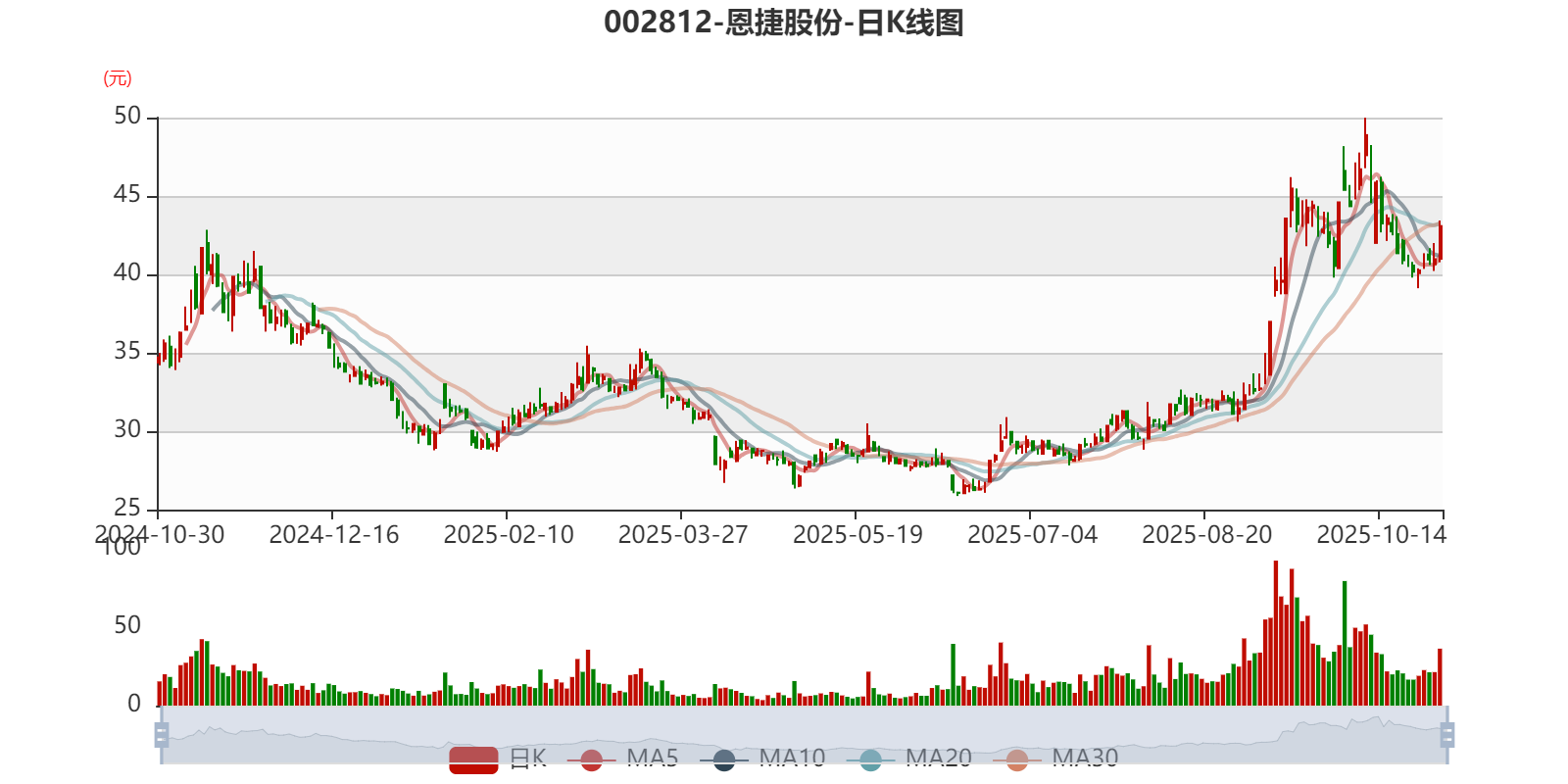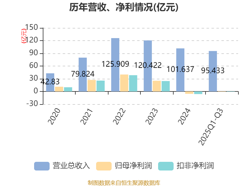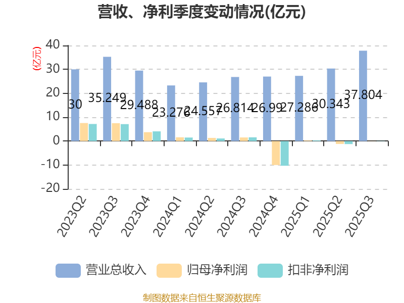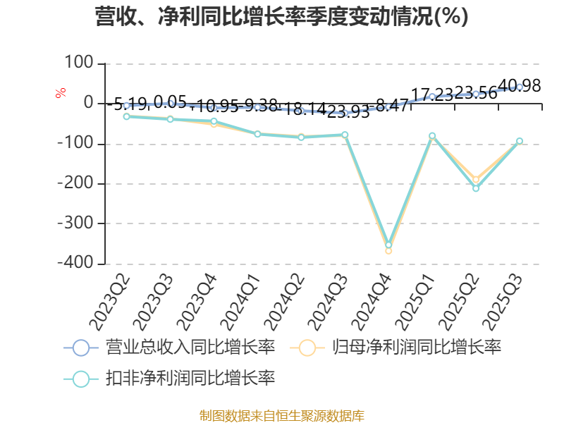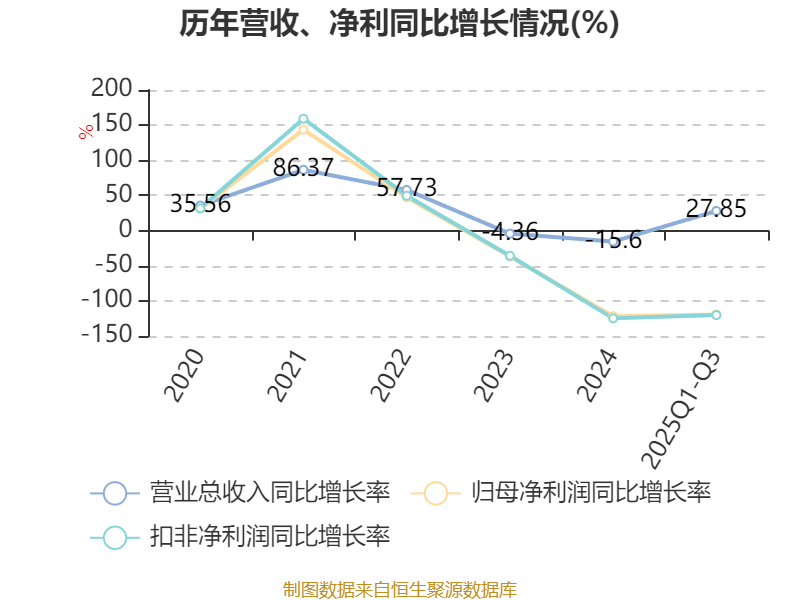 中证智能财讯恩捷股份(002812)10月30日披露2025年第三季度报告。前三季度公司实现营业总收入95.43亿元,同比增长27.85%;归母净利润亏损8632.3万元,上年同期盈利4.43亿元;扣非净利润亏损8436.52万元,上年同期盈利4.17亿元;经营活动产生的现金流量净额为8.77亿元,同比下降61.81%;报告期内,恩捷股份基本每股收益为-0.09元,加权平均净资产收益率为-0.35%。