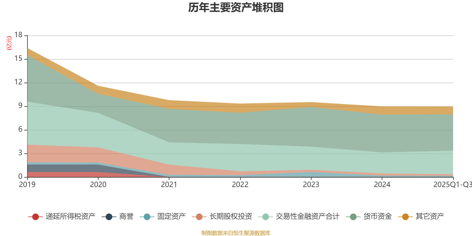 资产重大变化方面,截至2025年三季度末,公司交易性金融资产合计较上年末增加12.46%,占公司总资产比重上升3.75个百分点;货币资金较上年末减少4.16%,占公司总资产比重下降2.16个百分点;长期股权投资较上年末减少30.68%,占公司总资产比重下降0.94个百分点;使用权资产较上年末减少59.66%,占公司总资产比重下降0.62个百分点。