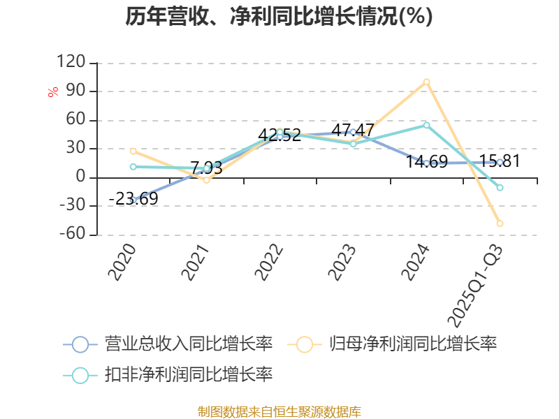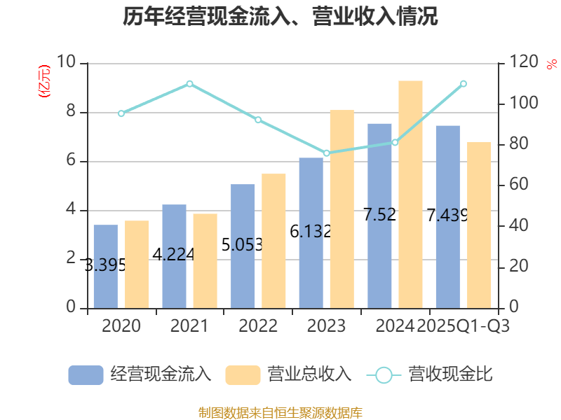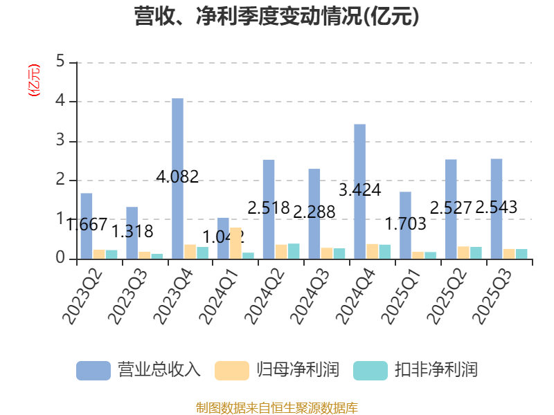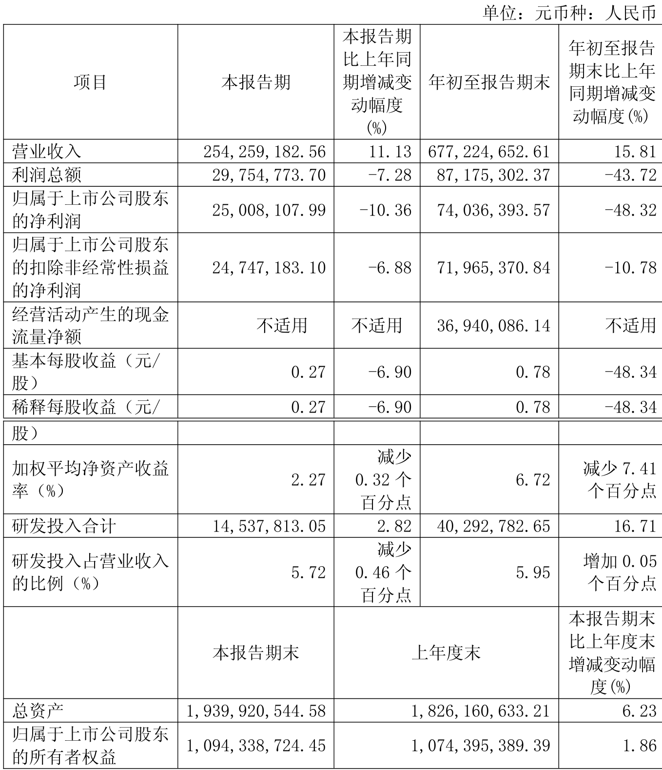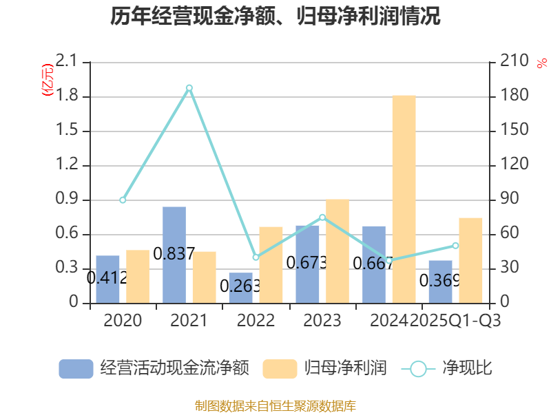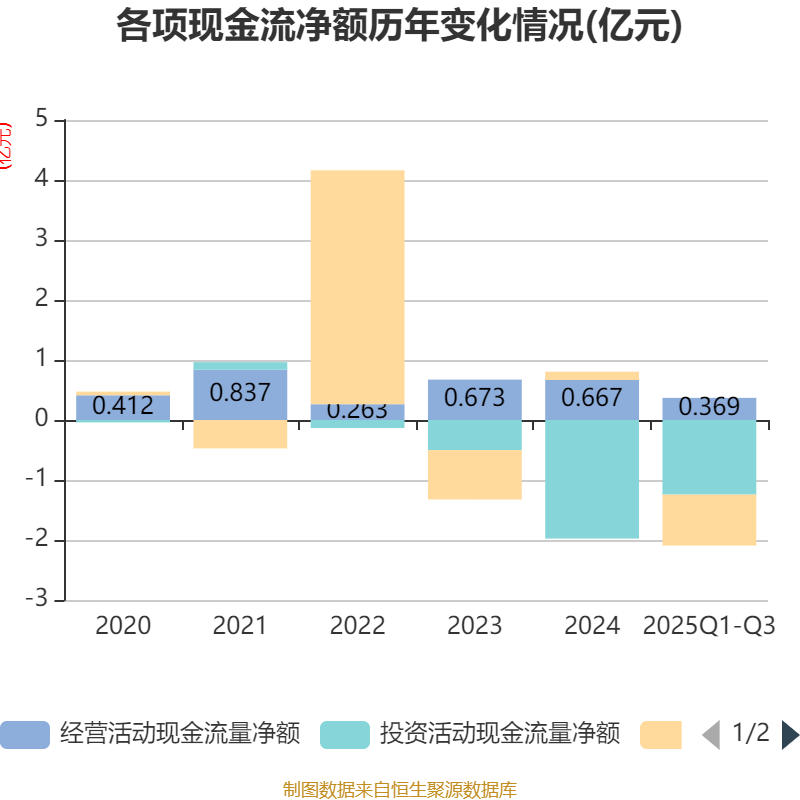 2025年前三季度,公司经营活动现金流净额为3694.01万元,同比增加5363.5万元;筹资活动现金流净额-8499.2万元,同比减少9427.4万元;投资活动现金流净额-1.24亿元,上年同期为-3.45亿元。