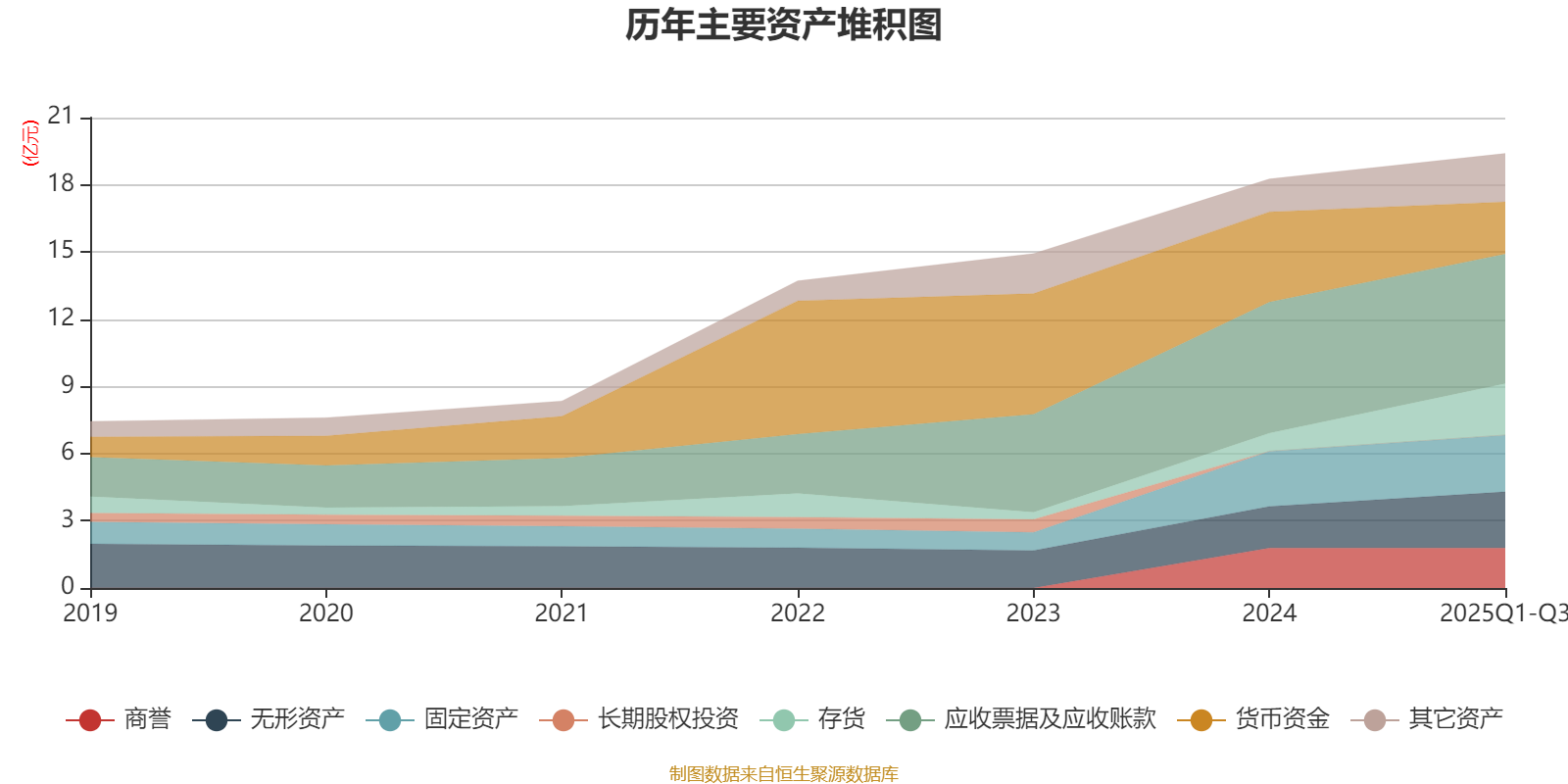 资产重大变化方面,截至2025年三季度末,公司货币资金较上年末减少42.25%,占公司总资产比重下降10.07个百分点;存货较上年末增加184.53%,占公司总资产比重上升7.41个百分点;无形资产较上年末增加35.44%,占公司总资产比重上升2.79个百分点;应收票据及应收账款较上年末减少1.04%,占公司总资产比重下降2.19个百分点。