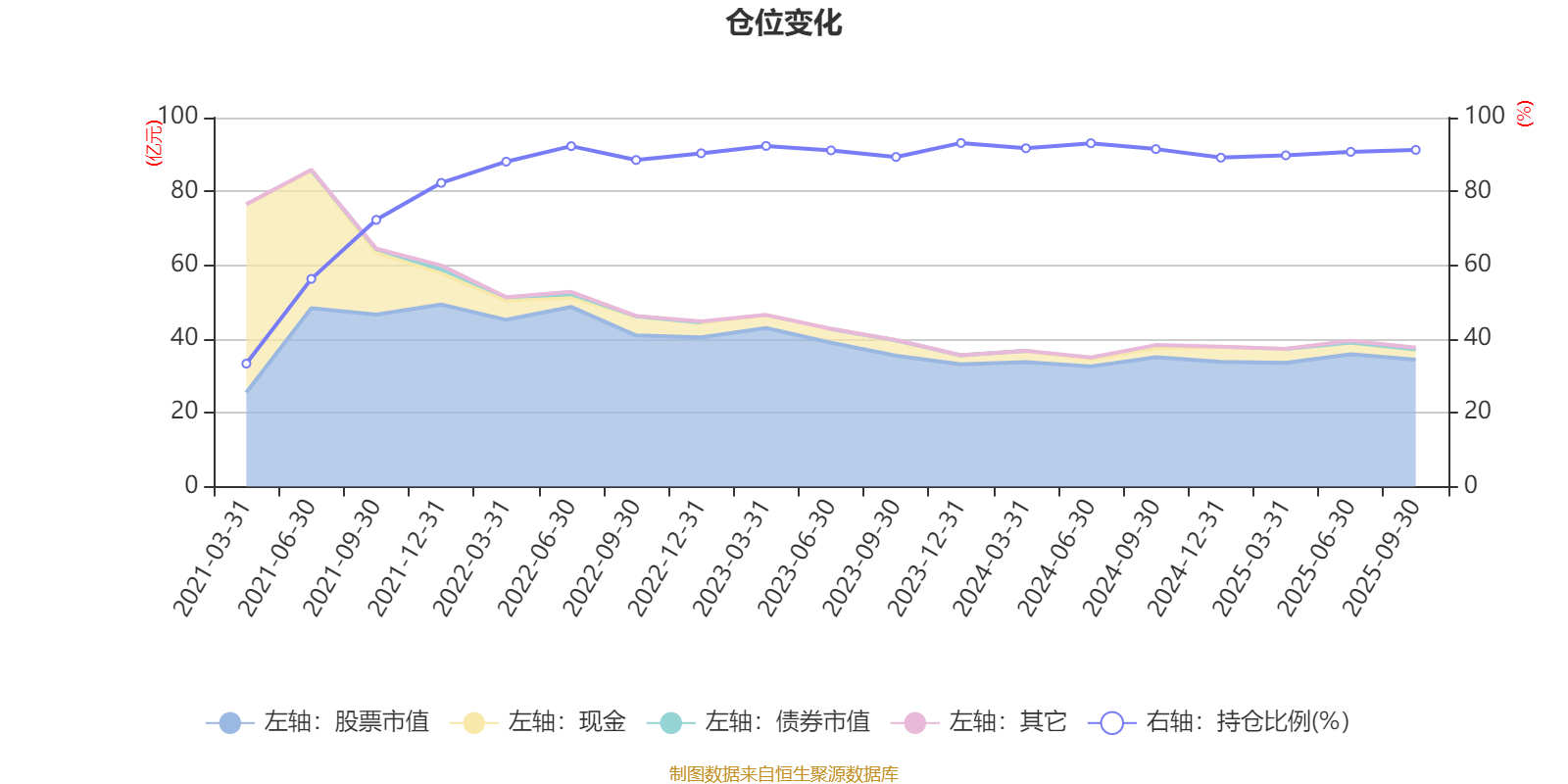 据定期报告数据统计,近三年平均股票仓位为91.11%,同类平均为86.15%。2023年末基金达到93.12%的最高仓位,2021年一季度末最低,为33.32%。