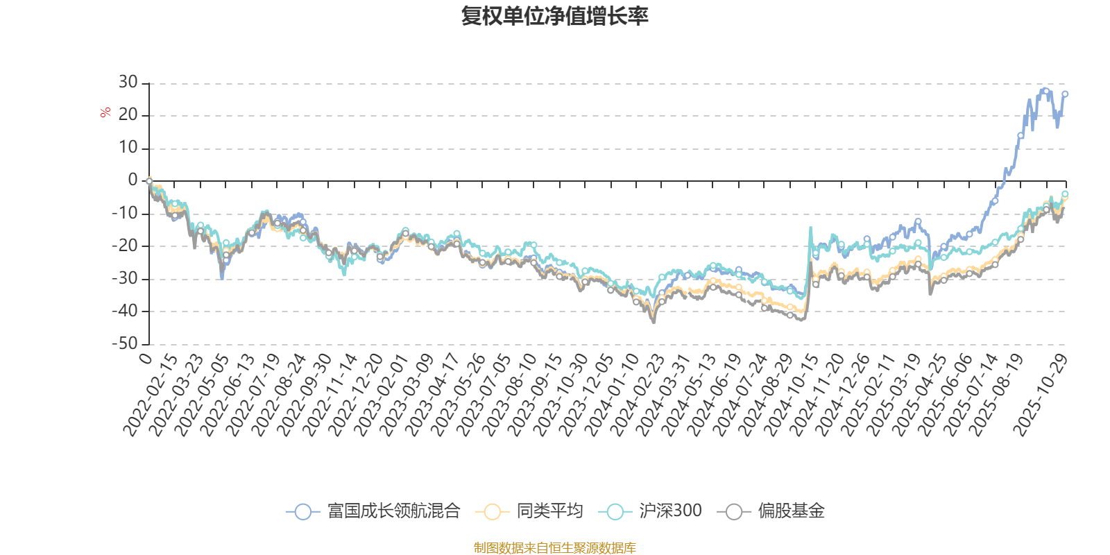 截至10月29日,富国成长领航混合近三个月复权单位净值增长率为21.63%,位于同类可比基金41/130;近半年复权单位净值增长率为60.90%,位于同类可比基金16/130;近一年复权单位净值增长率为57.33%,位于同类可比基金19/130;近三年复权单位净值增长率为67.57%,位于同类可比基金10/124。
