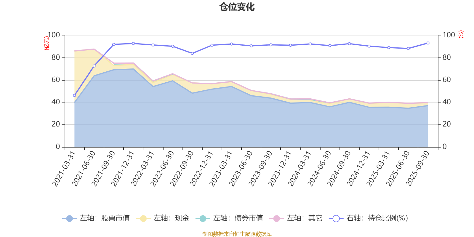据定期报告数据统计,近三年平均股票仓位为91.27%,同类平均为87.29%。2025年三季度末基金达到93.3%的最高仓位,2021年一季度末最低,为46.31%。