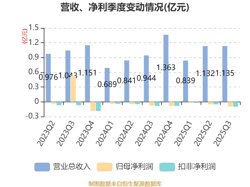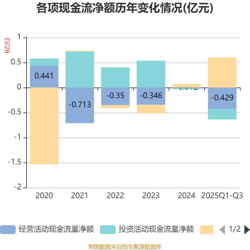 2025年前三季度,公司经营活动现金流净额为-4287.6万元,同比减少4449.69万元;筹资活动现金流净额6034.12万元,同比增加6204.22万元;投资活动现金流净额-2097.57万元,上年同期为211.02万元。