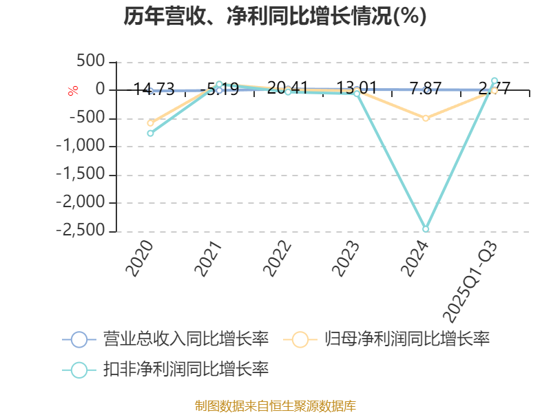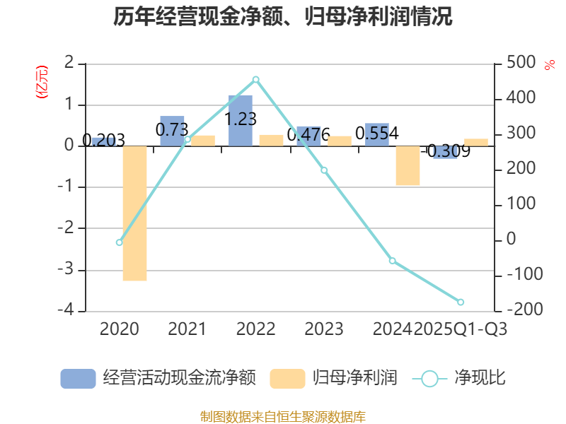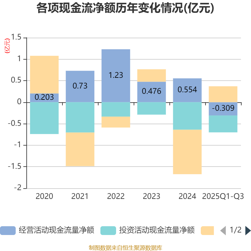 2025年前三季度,公司经营活动现金流净额为-3087.2万元,同比减少5724.85万元;筹资活动现金流净额3697.46万元,同比增加1.55亿元;投资活动现金流净额-3916.41万元,上年同期为-4557.8万元。