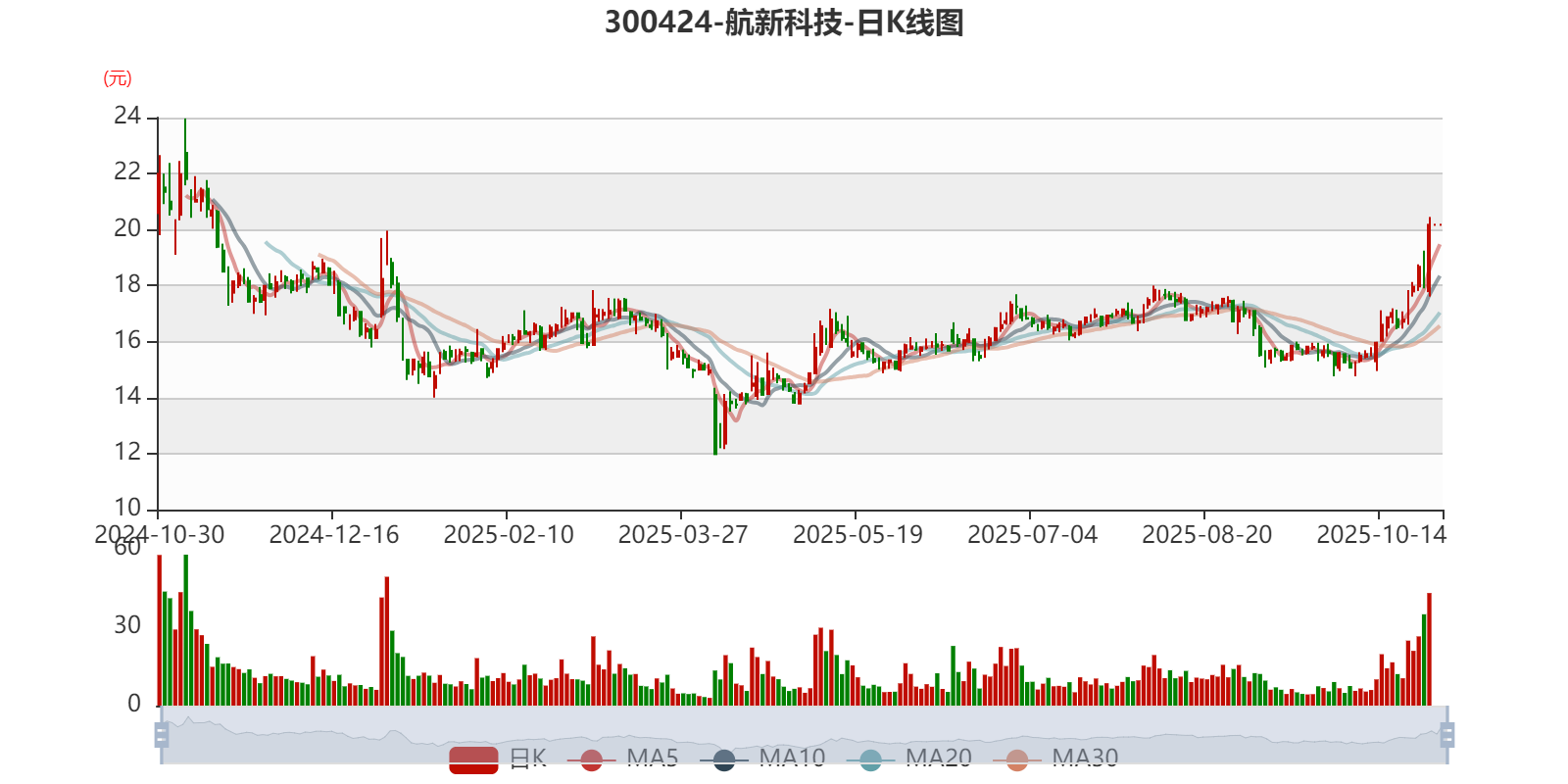 中证智能财讯航新科技(300424)10月30日披露2025年第三季度报告。前三季度公司实现营业总收入14.15亿元,同比增长2.77%;归母净利润1762.44万元,同比下降7.31%;扣非净利润1572.38万元,同比增长168.07%;经营活动产生的现金流量净额为-3087.2万元,上年同期为2637.65万元;报告期内,航新科技基本每股收益为0.0718元,加权平均净资产收益率为0.02%。