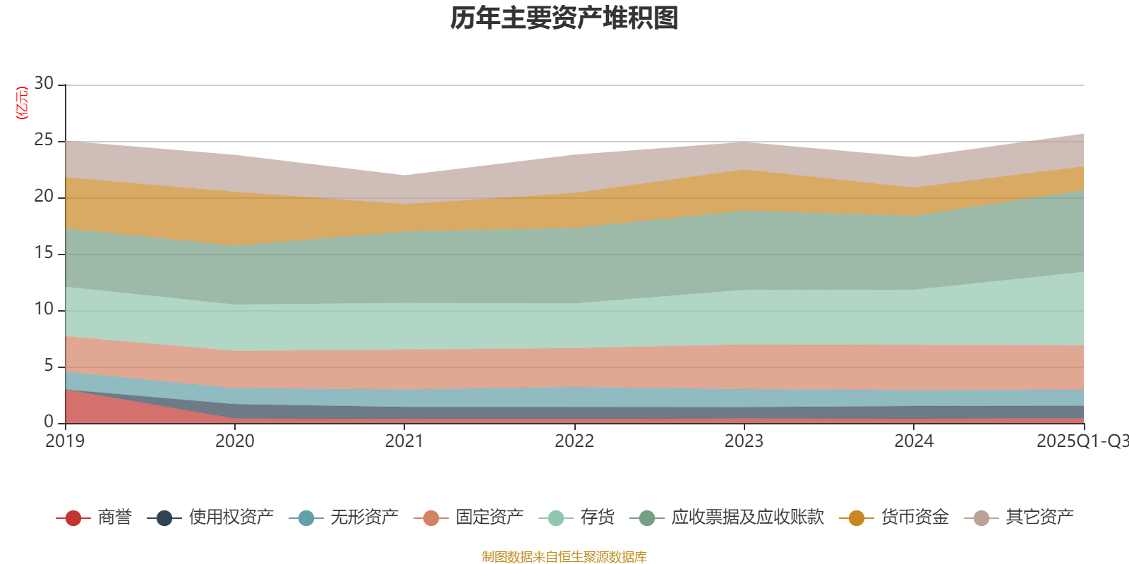 资产重大变化方面,截至2025年三季度末,公司存货较上年末增加32.93%,占公司总资产比重上升4.59个百分点;货币资金较上年末减少15.62%,占公司总资产比重下降2.39个百分点;固定资产较上年末减少1.17%,占公司总资产比重下降1.56个百分点;其他应收款(含利息和股利)较上年末增加224.18%,占公司总资产比重上升0.57个百分点。