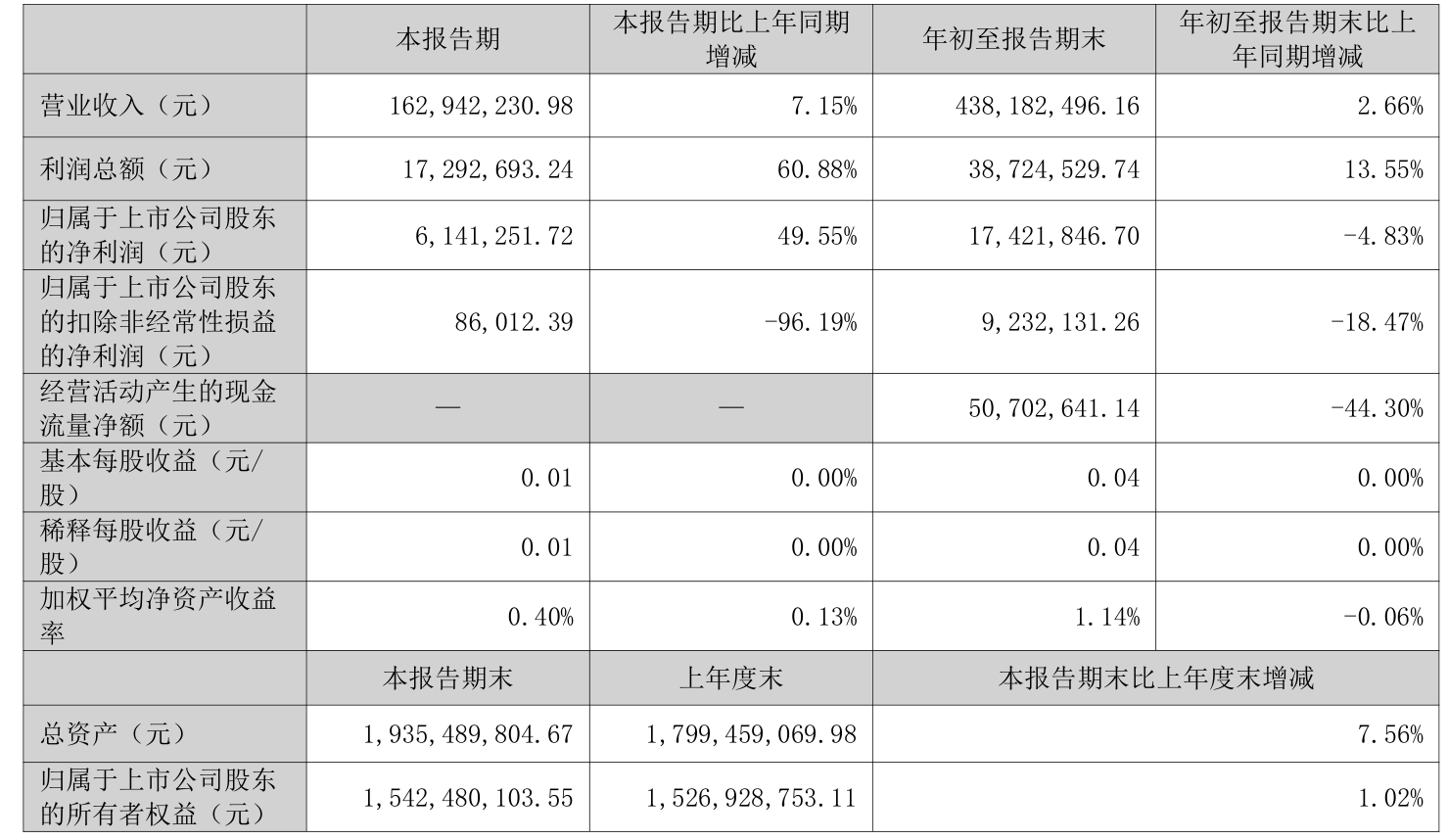 中证智能财讯凯恩股份(002012)10月30日披露2025年第三季度报告。前三季度公司实现营业总收入4.38亿元,同比增长2.66%;归母净利润1742.18万元,同比下降4.83%;扣非净利润923.21万元,同比下降18.47%;经营活动产生的现金流量净额为5070.26万元,同比下降44.30%;报告期内,凯恩股份基本每股收益为0.04元,加权平均净资产收益率为1.14%。