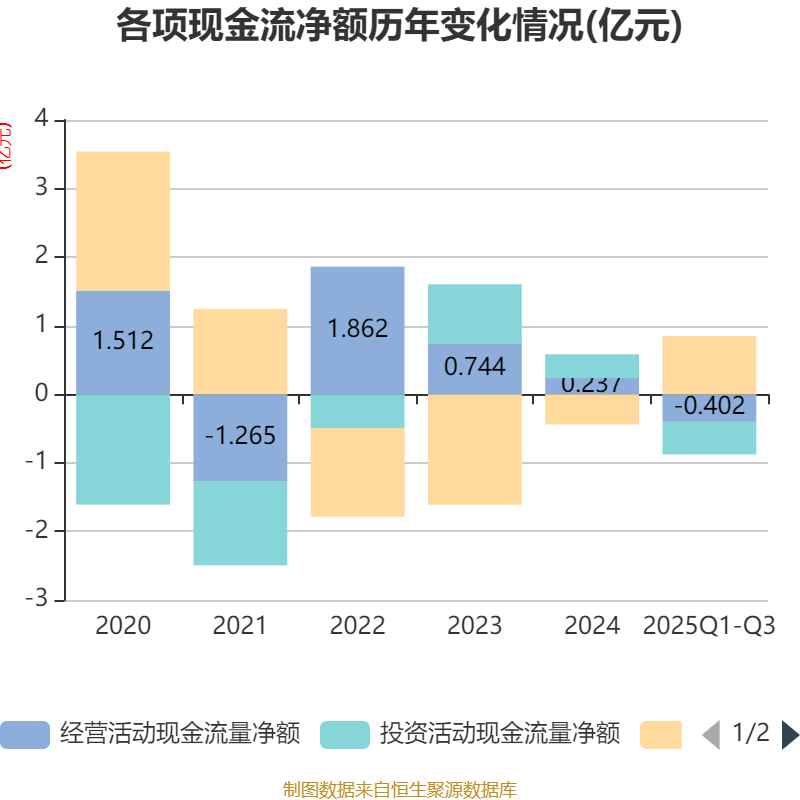 2025年前三季度,公司经营活动现金流净额为-4020.96万元,同比减少6195.72万元;筹资活动现金流净额8488.62万元,同比增加8413.87万元;投资活动现金流净额-4736.02万元,上年同期为3692.78万元。