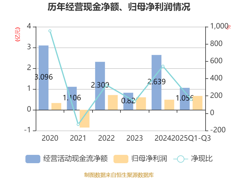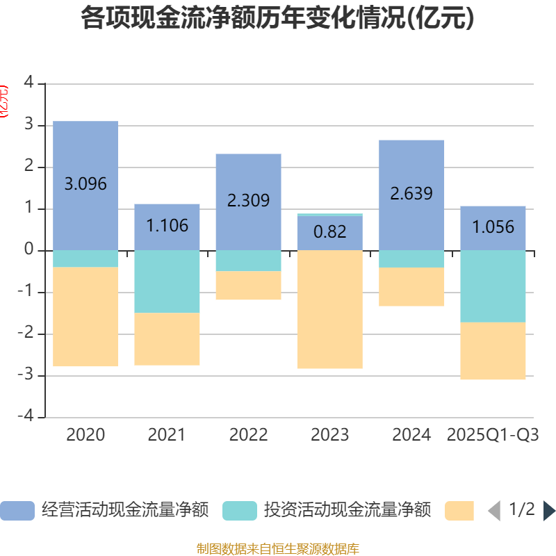 2025年前三季度,公司经营活动现金流净额为1.06亿元,同比增长11.14%;筹资活动现金流净额-1.37亿元,同比减少2708万元;投资活动现金流净额-1.73亿元,上年同期为-1.48亿元。