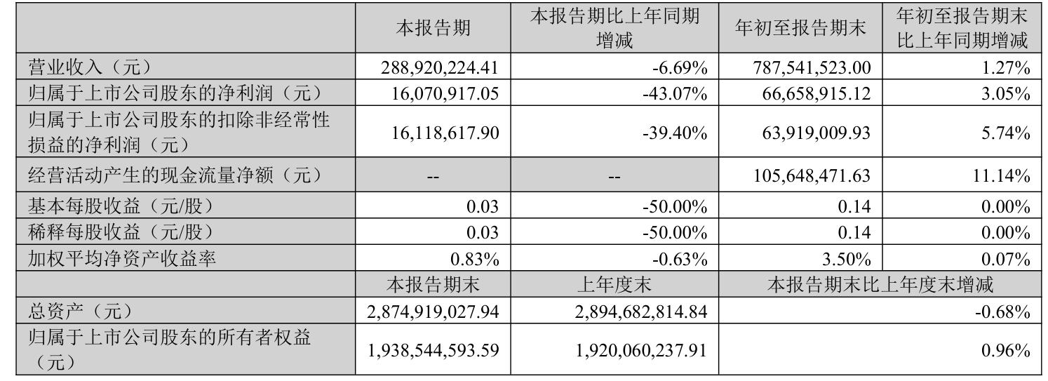 中证智能财讯迪森股份(300335)10月30日披露2025年第三季度报告。前三季度公司实现营业总收入7.88亿元,同比增长1.27%;归母净利润6665.89万元,同比增长3.05%;扣非净利润6391.9万元,同比增长5.74%;经营活动产生的现金流量净额为1.06亿元,同比增长11.14%;报告期内,迪森股份基本每股收益为0.14元,加权平均净资产收益率为3.50%。