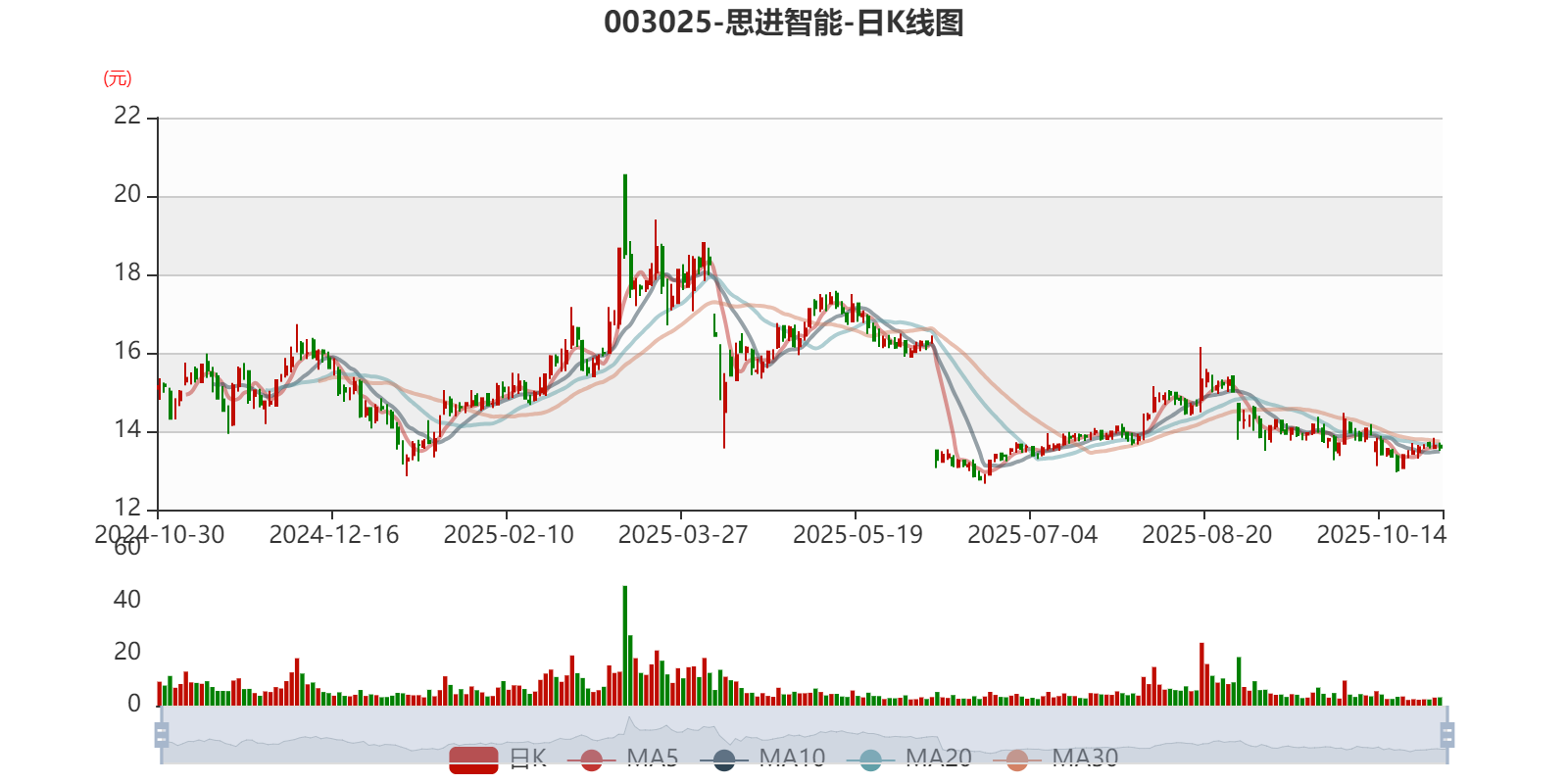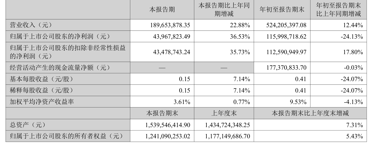 中证智能财讯思进智能(003025)10月30日披露2025年第三季度报告。前三季度公司实现营业总收入5.24亿元,同比增长12.44%;归母净利润1.16亿元,同比下降24.13%;扣非净利润1.13亿元,同比增长17.80%;经营活动产生的现金流量净额为1.77亿元,同比下降0.03%;报告期内,思进智能基本每股收益为0.41元,加权平均净资产收益率为9.53%。