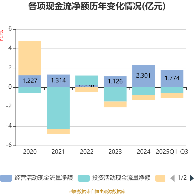 2025年前三季度,公司经营活动现金流净额为1.77亿元,同比下降0.03%;筹资活动现金流净额-5218.42万元,同比减少469.11万元;投资活动现金流净额-5675.62万元,上年同期为-3209.41万元。