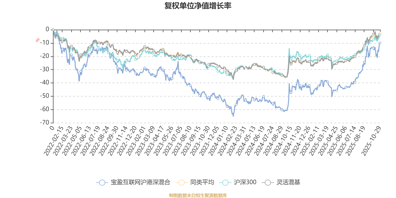 截至10月29日,宝盈互联网沪港深混合近三个月复权单位净值增长率为33.47%,位于同类可比基金145/1287;近半年复权单位净值增长率为63.55%,位于同类可比基金95/1287;近一年复权单位净值增长率为59.71%,位于同类可比基金113/1287;近三年复权单位净值增长率为34.11%,位于同类可比基金333/1286。