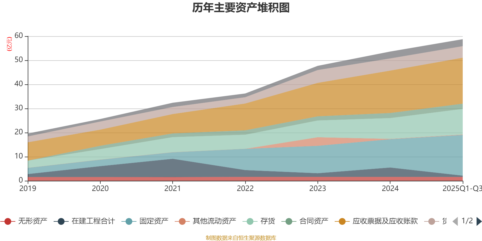 资产重大变化方面,截至2025年三季度末,公司固定资产较上年末增加43.68%,占公司总资产比重上升6.83个百分点;在建工程合计较上年末减少86.16%,占公司总资产比重下降6.32个百分点;存货较上年末增加23.36%,占公司总资产比重上升2.03个百分点;交易性金融资产合计较上年末减少80.78%,占公司总资产比重下降1.27个百分点。