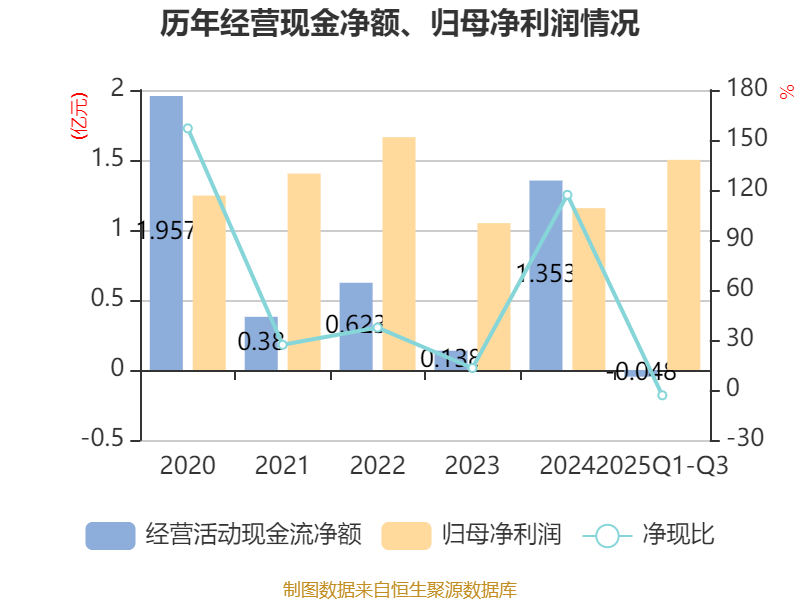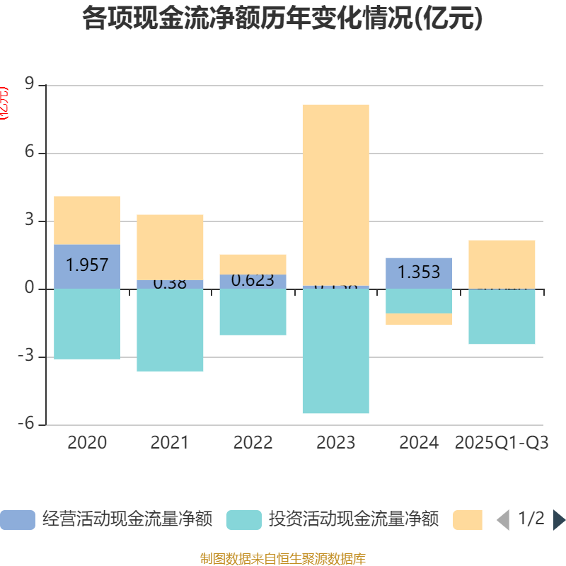 2025年前三季度,公司经营活动现金流净额为-477.33万元,同比减少5970.89万元;筹资活动现金流净额2.13亿元,同比增加1.46亿元;投资活动现金流净额-2.4亿元,上年同期为-1.83亿元。