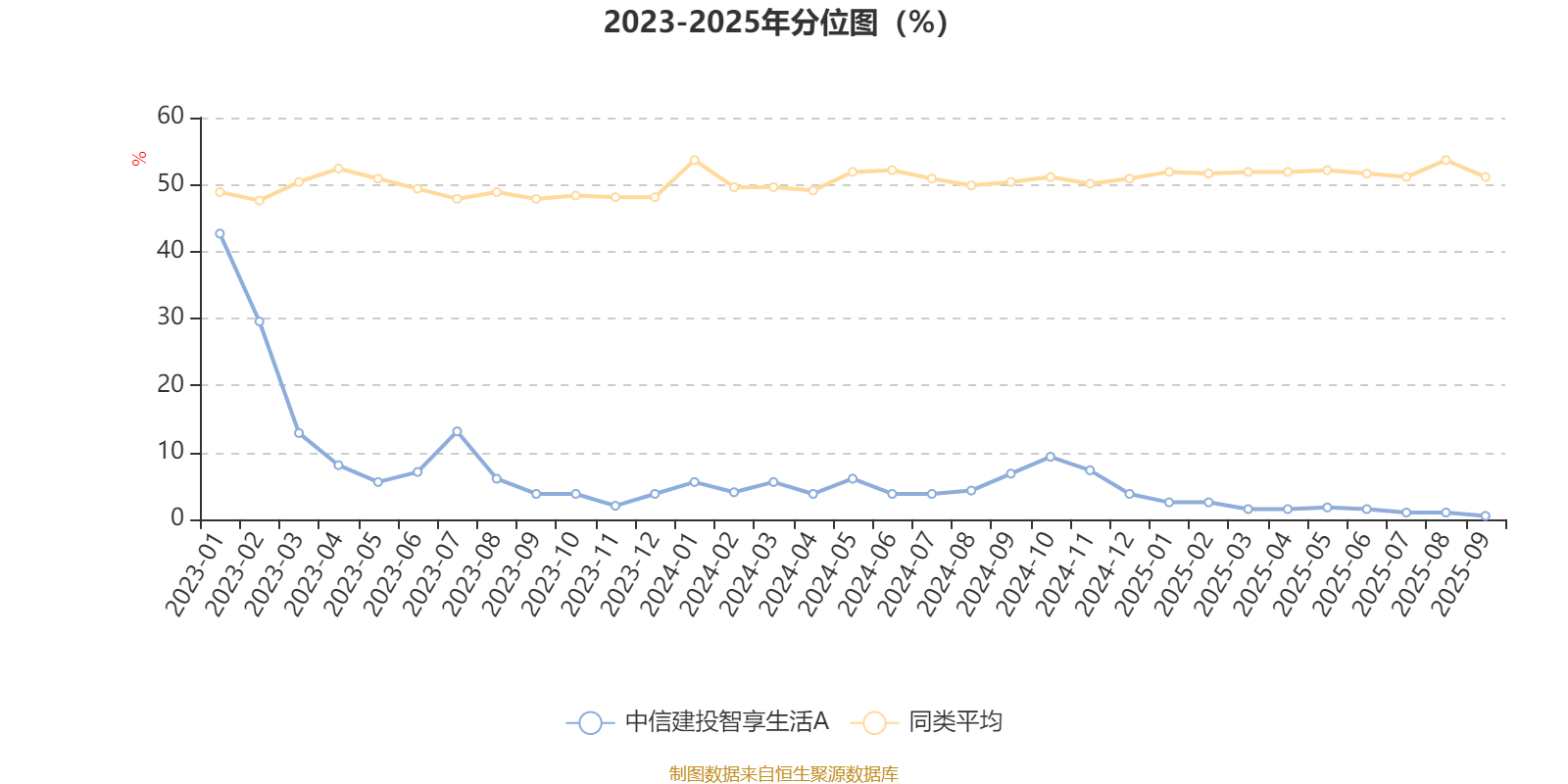 通过所选区间该基金净值增长率分位图,可以观察该基金与同类基金业绩比较情况。图为坐标原点到区间内某时点的净值增长率在同类基金中的分位数。