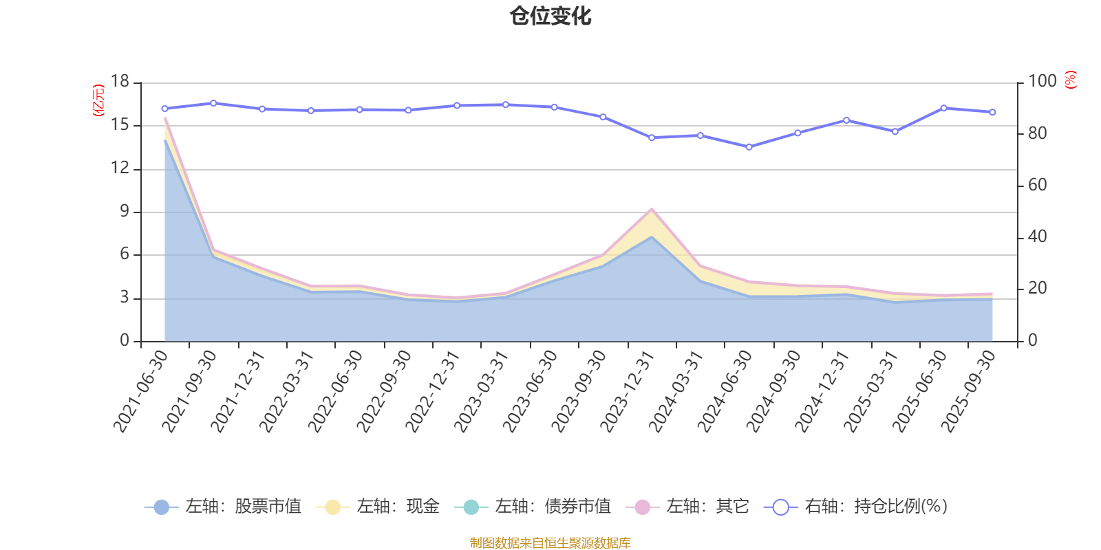 据定期报告数据统计,近三年平均股票仓位为84.89%,同类平均为85.66%。2021年三季度末基金达到92.03%的最高仓位,2024年上半年末最低,为75.09%。