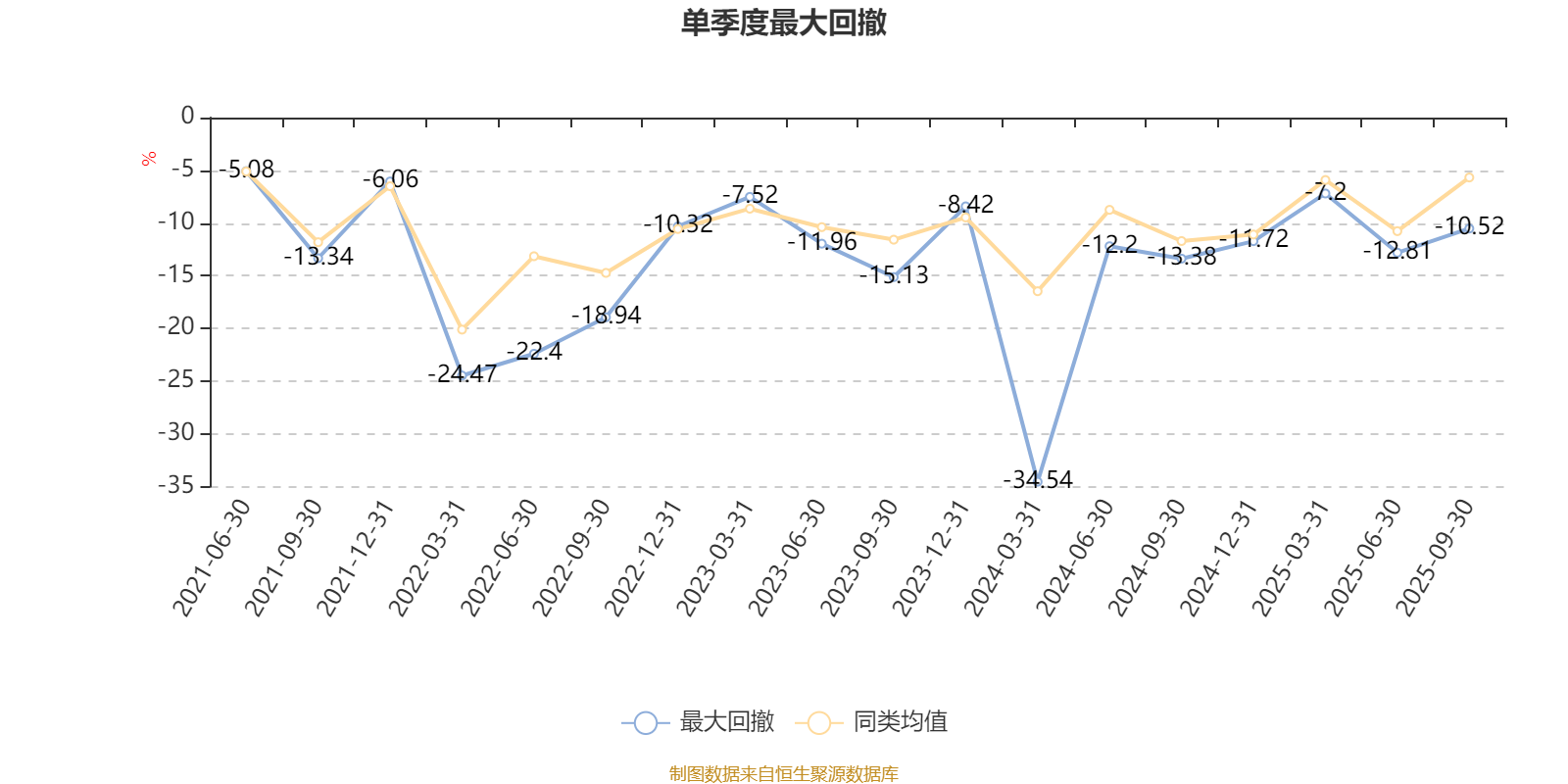 截至10月29日,基金近三年最大回撤为36.75%,同类可比基金排名287/513。单季度最大回撤出现在2024年一季度,为34.54%。