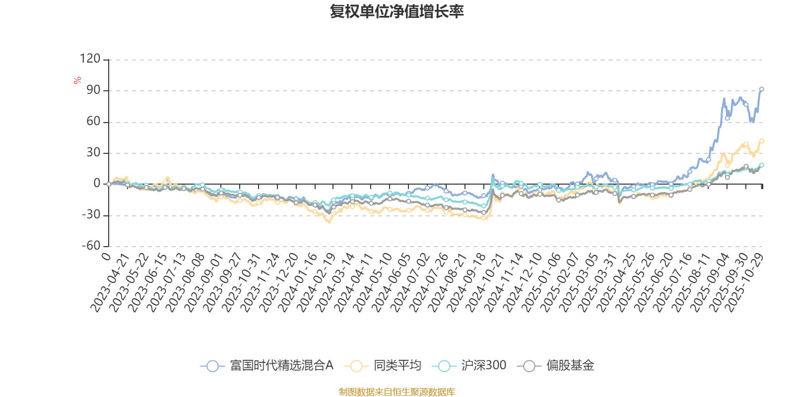 截至10月29日,富国时代精选混合A近三个月复权单位净值增长率为53.62%,位于同类可比基金25/229;近半年复权单位净值增长率为93.22%,位于同类可比基金32/229;近一年复权单位净值增长率为95.07%,位于同类可比基金28/213。