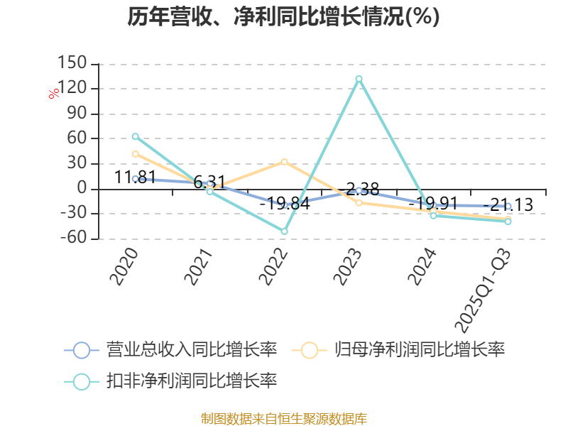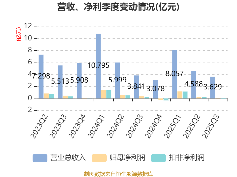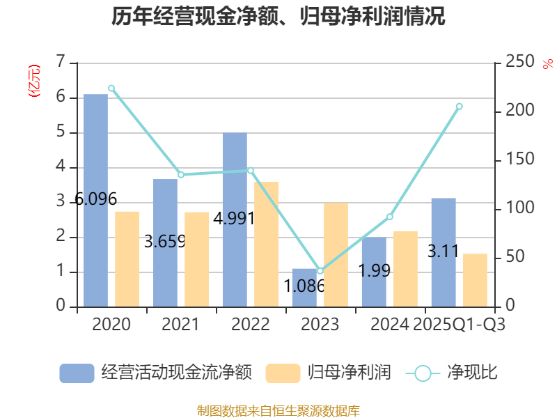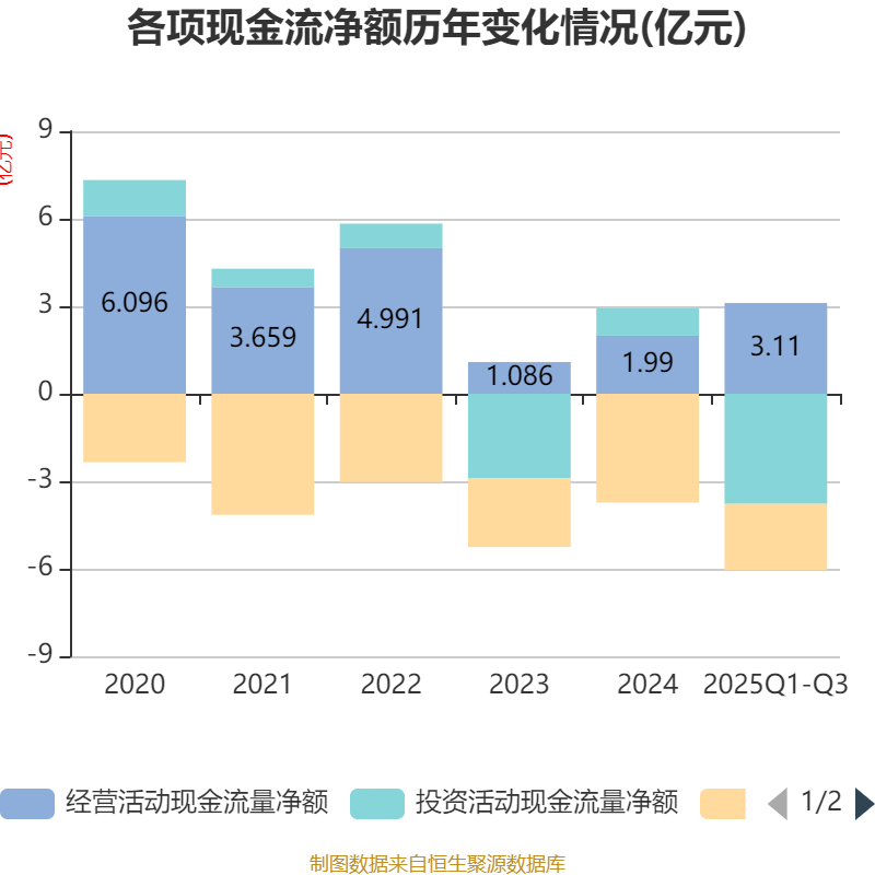 2025年前三季度,公司经营活动现金流净额为3.11亿元,同比增加3.84亿元;筹资活动现金流净额-2.27亿元,同比增加5888.57万元;投资活动现金流净额-3.77亿元,上年同期为-1.22亿元。