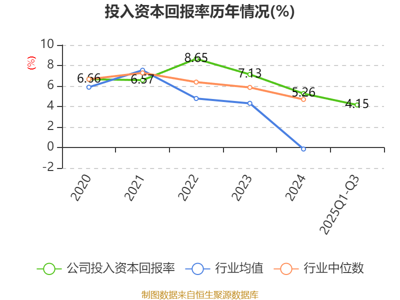 盈利能力方面, 2025年前三季度公司加权平均净资产收益率为4.11%,同比下降2.08个百分点。公司2025年前三季度投入资本回报率为4.15%,较上年同期下降1.78个百分点。