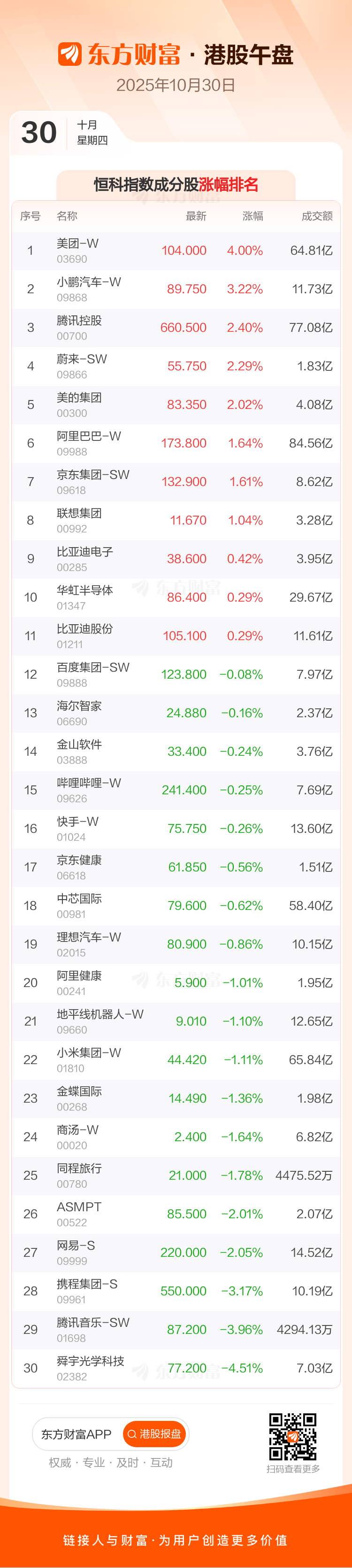 港股10月30日午盘走高,恒生指数收报26488.42点,涨142.28点,涨幅0.54%;恒生科技指数收报6112.09点,涨18.65点,涨幅0.31%。恒生指数成分股中中国宏桥、紫金矿业、信义光能涨幅居前,舜宇光学科技、中通快递-W、药明康德跌幅靠前。恒生科技指数成分股中美团-W、小鹏汽车-W、腾讯控股涨幅居前,舜宇光学科技、腾讯音乐-SW、携程集团-S跌幅靠前。
