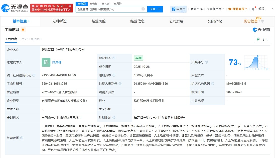 每经AI快讯,天眼查App显示,近日,超讯智算(三明)科技有限公司成立,法定代表人为陈厚健,注册资本1000万元人民币,经营范围包括数字技术服务、互联网数据服务、大数据服务、数据处理和存储支持服务、人工智能公共数据平台等。股东信息显示,该公司由超讯通信(603322)、广州云上鸿图投资合伙企业(有限合伙)、广州华汇智算数字信息技术有限公司共同持股。
