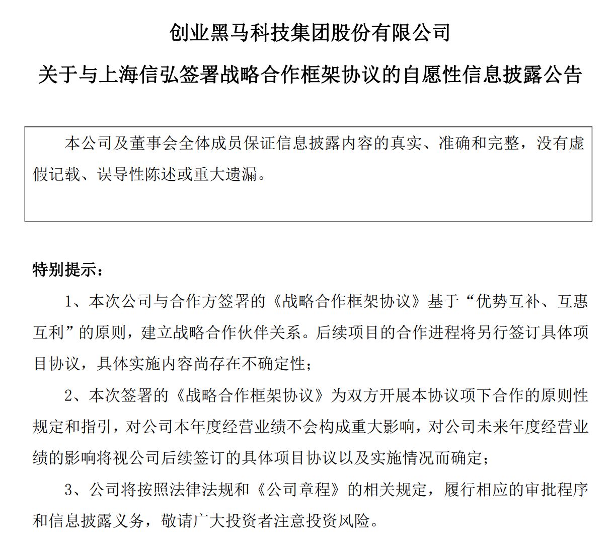 创业黑马在公告中表示,本次合作符合公司整体发展战略规划,能够与现有业务形成有效协同。本协议的签署不会导致上市公司主营业务、经营范围发生变化,对公司本年度的营业收入、净利润等暂不会产生直接影响,对公司未来经营业绩的影响需视具体项目能否顺利推进和具体实施情况而定,具有不确定性。