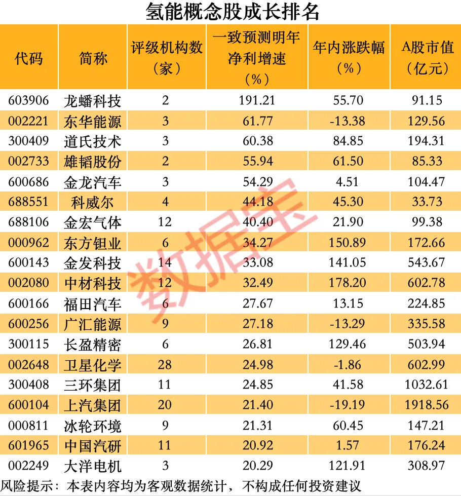 从成长性来看,根据机构一致预测,两家机构以上评级个股中,有19只概念股明年净利增速超20%。其中,龙蟠科技增速位居第一,超过191%,东华能源、道氏技术、雄韬股份等个股增速均超50%。