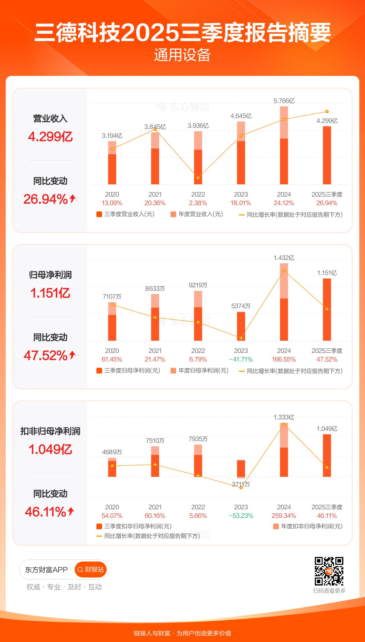 三德科技10月24日发布2025年三季报显示,公司前三季实现营业收入4.30亿元,同比增长26.94%;归母净利润1.15亿元,同比增长47.52%;扣非归母净利润1.05亿元,同比增长46.11%。