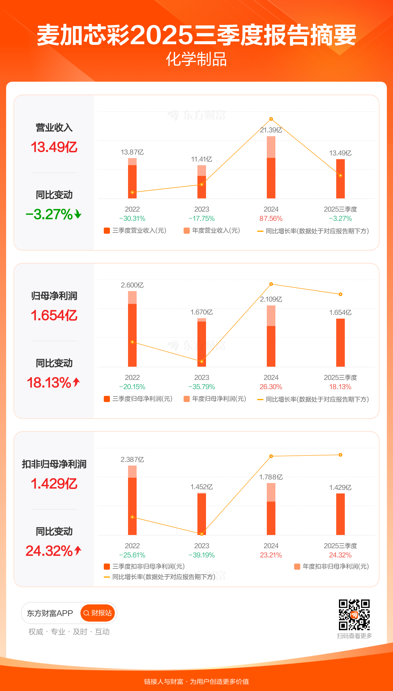 麦加芯彩10月24日发布2025年三季报显示,公司前三季实现营业收入13.49亿元,同比下滑3.27%;归母净利润1.65亿元,同比增长18.13%;扣非归母净利润1.43亿元,同比增长24.32%