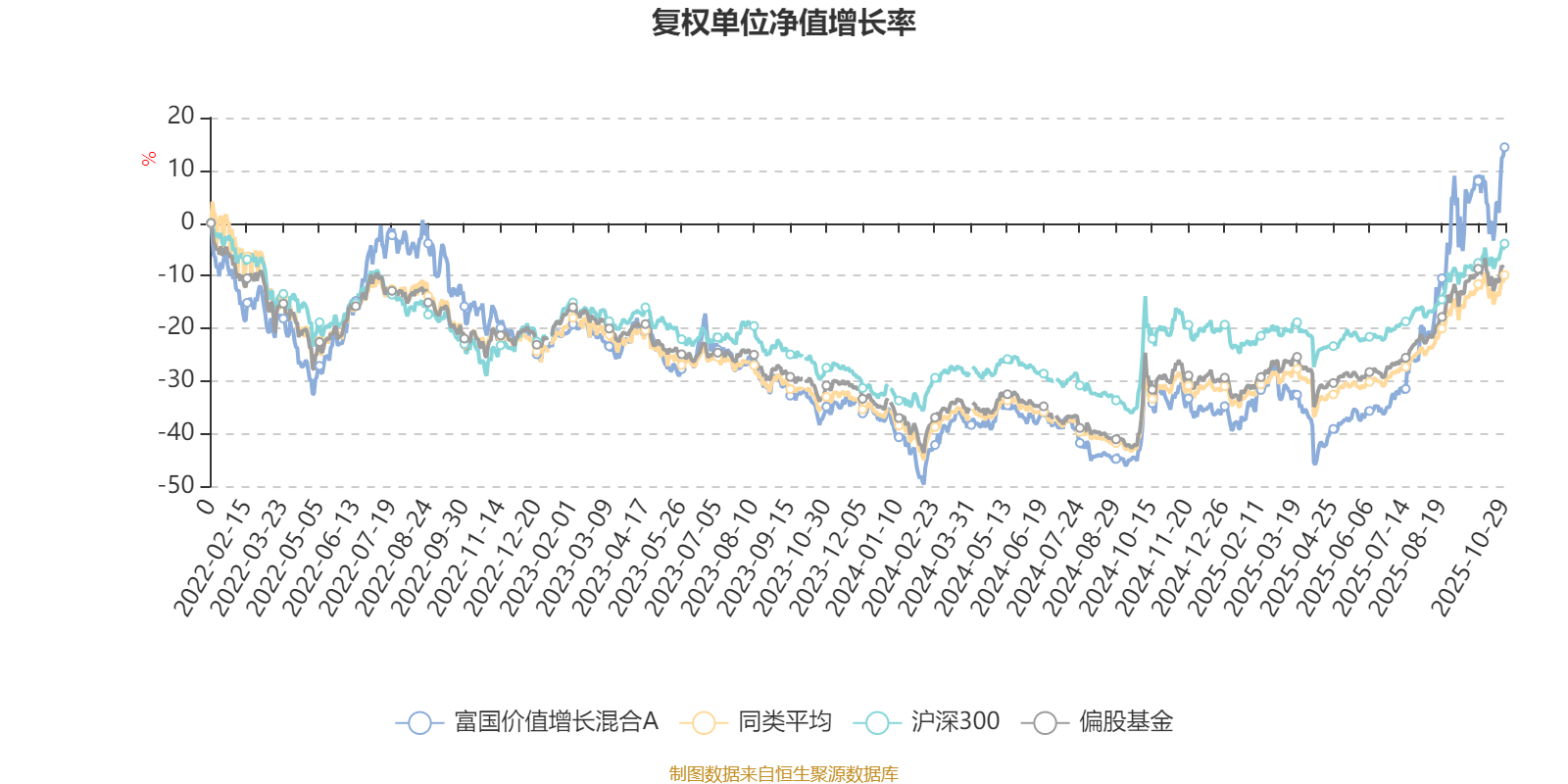 截至10月29日,富国价值增长混合A近三个月复权单位净值增长率为41.92%,位于同类可比基金9/265;近半年复权单位净值增长率为89.52%,位于同类可比基金4/265;近一年复权单位净值增长率为71.79%,位于同类可比基金12/265;近三年复权单位净值增长率为43.37%,位于同类可比基金49/253。