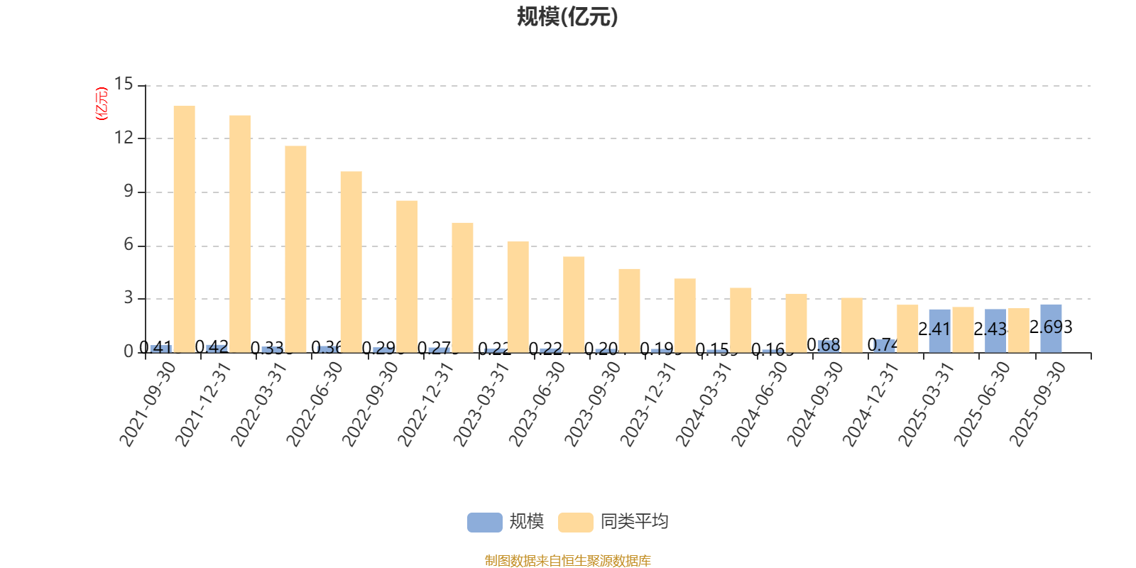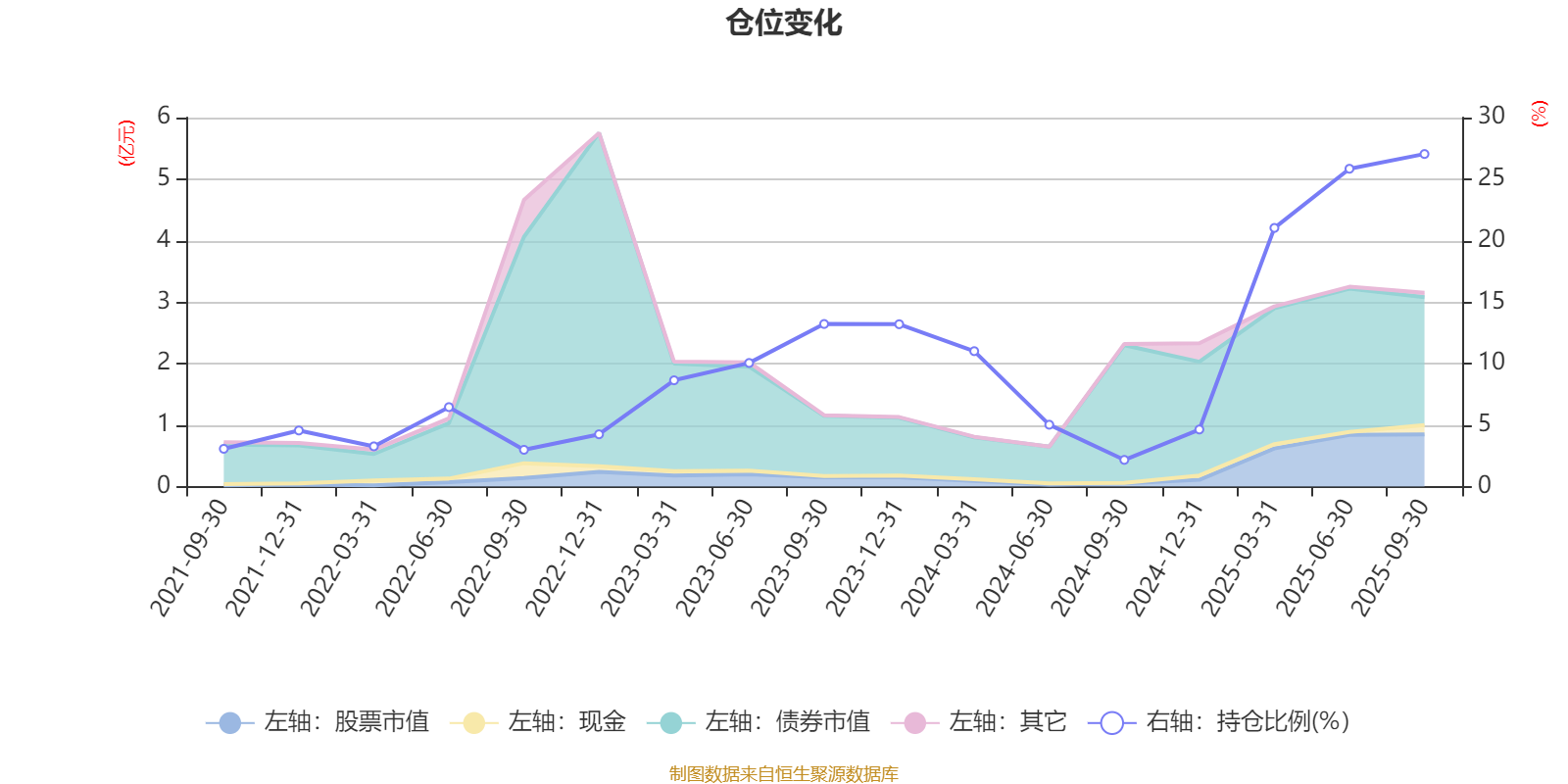 据定期报告数据统计,近三年平均股票仓位为12.18%,同类平均为19.14%。2025年三季度末基金达到27.04%的最高仓位,2024年三季度末最低,为2.17%。