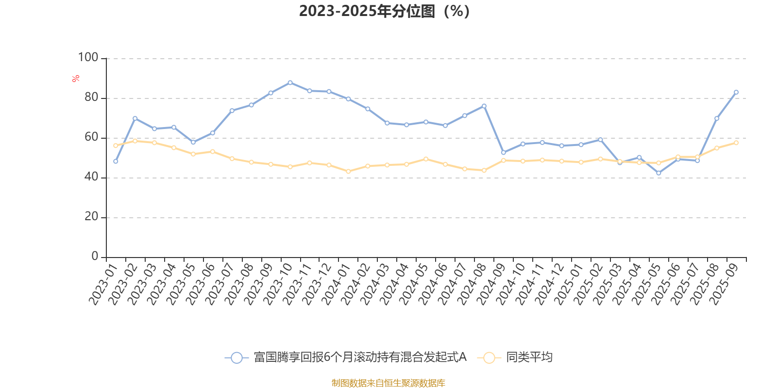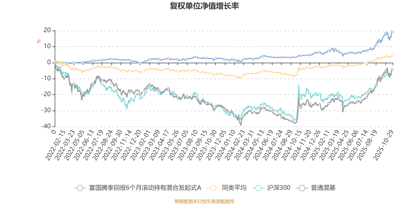 截至10月29日,富国腾享回报6个月滚动持有混合发起式A近三个月复权单位净值增长率为9.11%,位于同类可比基金35/629;近半年复权单位净值增长率为12.57%,位于同类可比基金60/629;近一年复权单位净值增长率为14.12%,位于同类可比基金66/623;近三年复权单位净值增长率为17.45%,位于同类可比基金134/557。