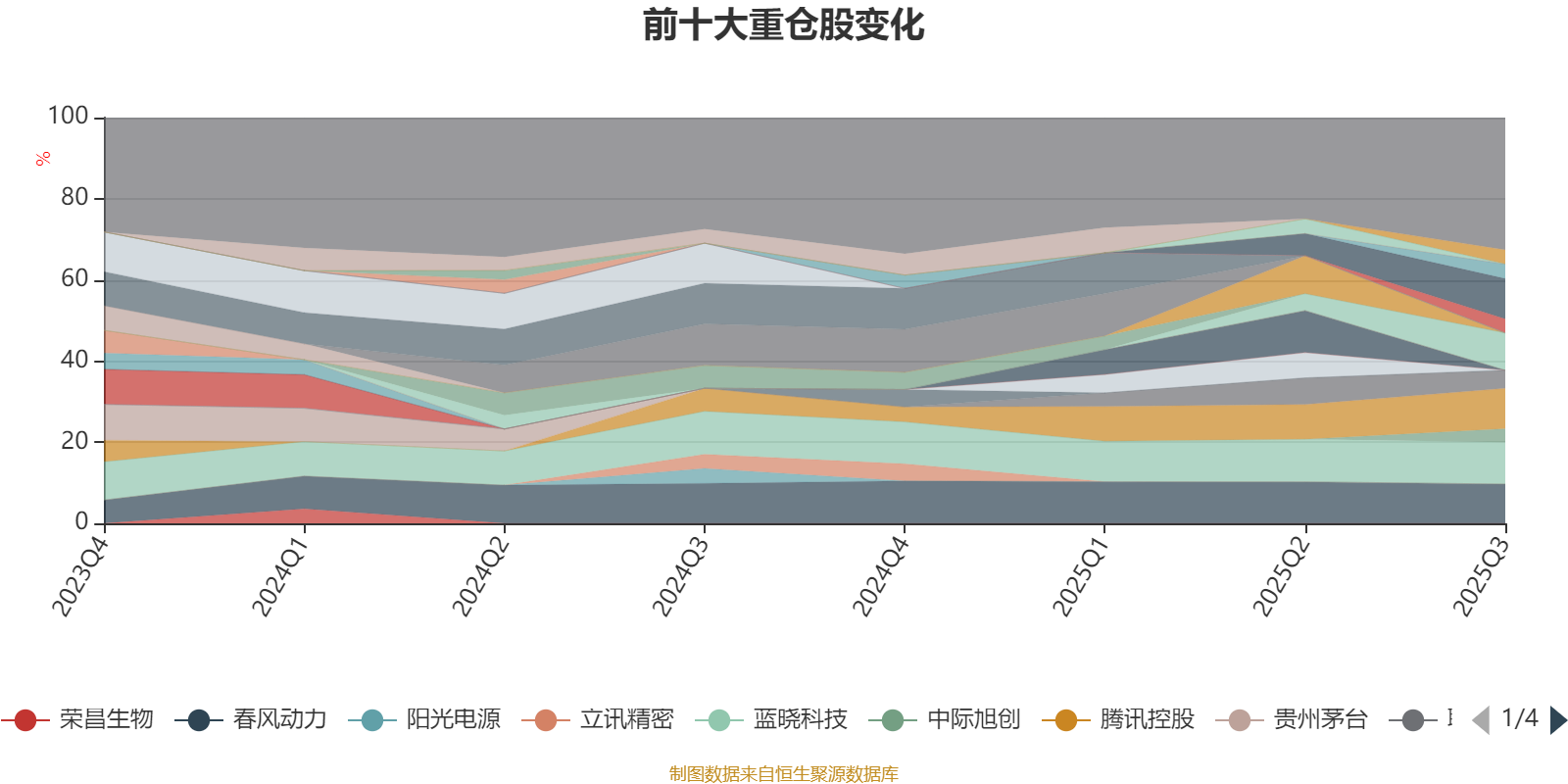该基金持股集中度较高,近2年前十大重仓股集中度长期超过60%。截至2025年三季度末,基金十大重仓股分别是蓝晓科技、腾讯控股、热景生物、春风动力、悦康药业、联邦制药、新易盛、兆易创新、中芯国际、中际旭创。