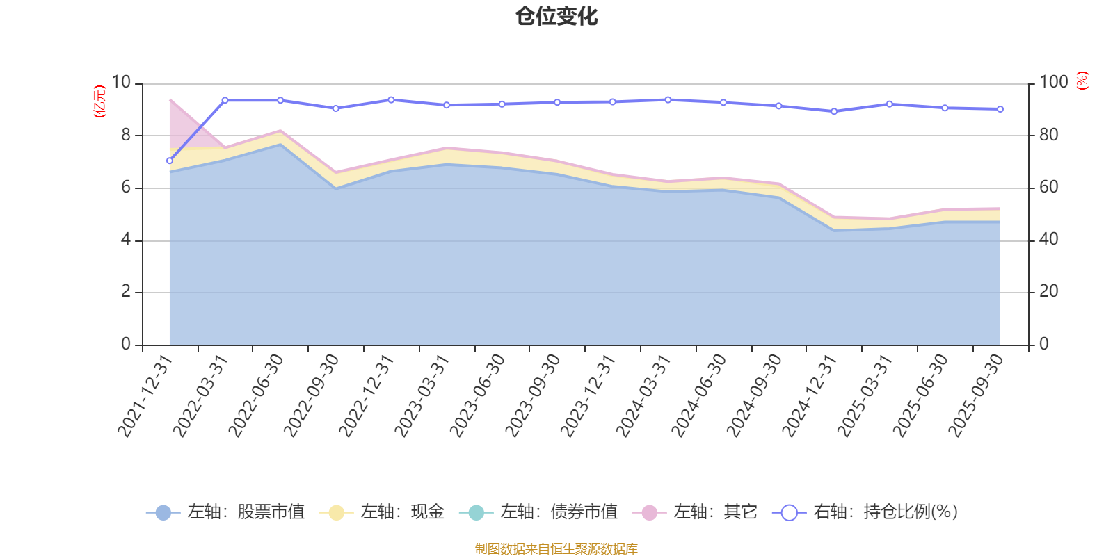 据定期报告数据统计,近三年平均股票仓位为91.95%,同类平均为85.66%。2022年末基金达到93.73%的最高仓位,2021年末最低,为70.46%。