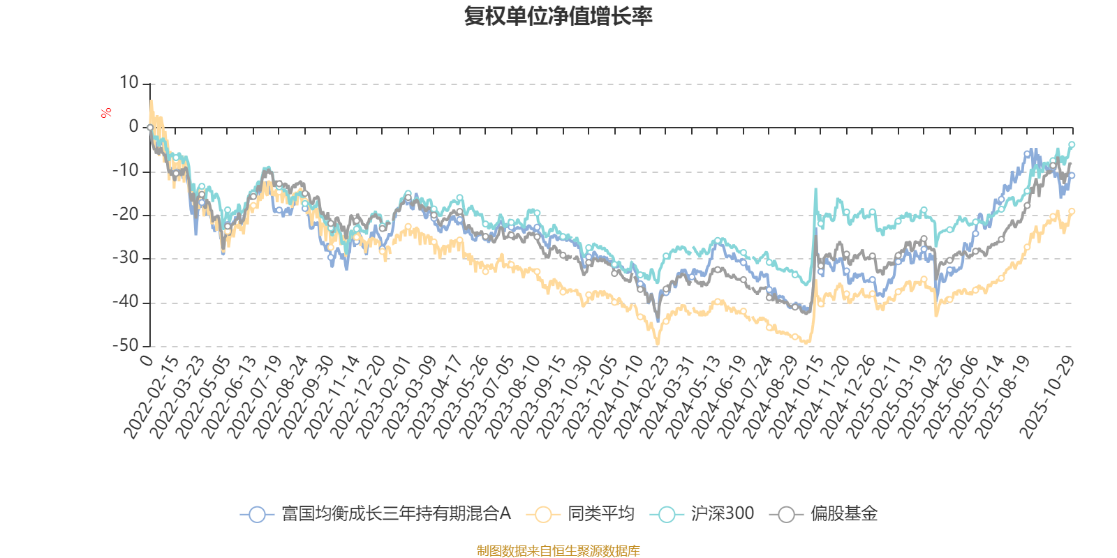 截至10月29日,富国均衡成长三年持有期混合A近三个月复权单位净值增长率为-1.16%,位于同类可比基金601/621;近半年复权单位净值增长率为33.82%,位于同类可比基金254/621;近一年复权单位净值增长率为30.45%,位于同类可比基金307/611;近三年复权单位净值增长率为30.29%,位于同类可比基金183/518。