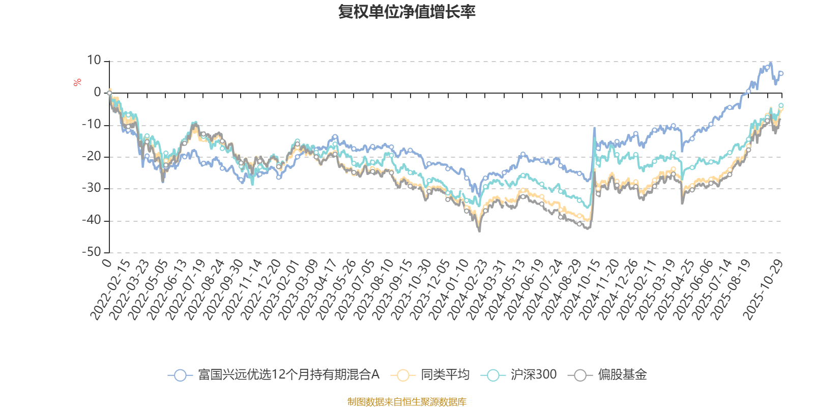 截至10月29日,富国兴远优选12个月持有期混合A近三个月复权单位净值增长率为10.05%,位于同类可比基金93/130;近半年复权单位净值增长率为22.34%,位于同类可比基金88/130;近一年复权单位净值增长率为26.57%,位于同类可比基金72/130;近三年复权单位净值增长率为44.64%,位于同类可比基金36/124。