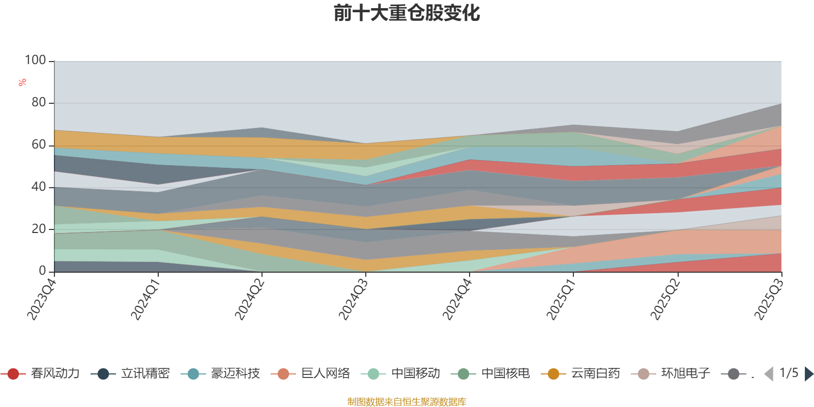 该基金持股集中度较高,近2年前十大重仓股集中度长期超过60%。截至2025年三季度末,基金十大重仓股分别是科沃斯、巨人网络、华测导航、春风动力、海大集团、国光股份、环旭电子、九号公司、美的集团、香港交易所。