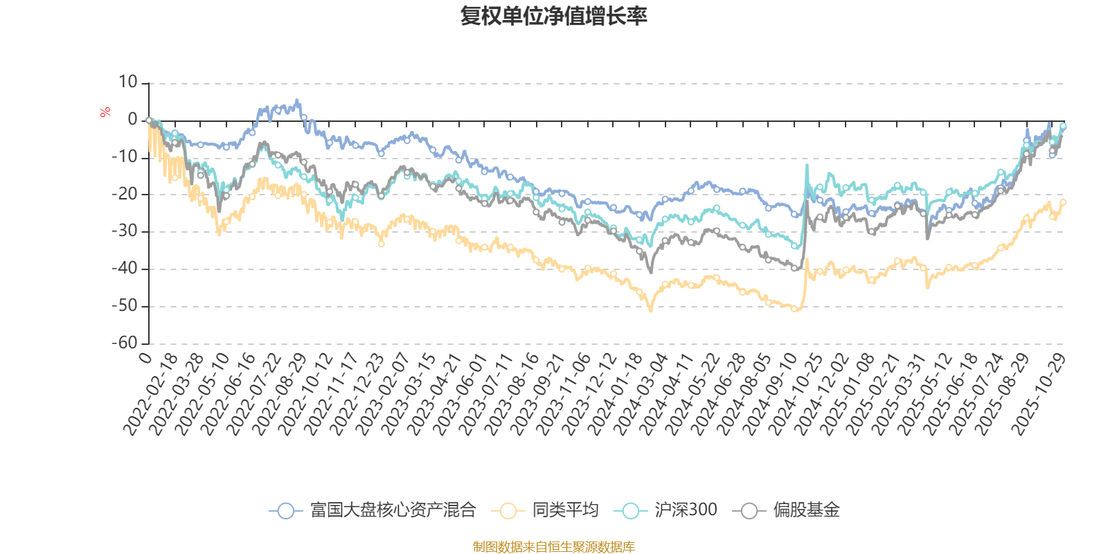 截至10月29日,富国大盘核心资产混合近三个月复权单位净值增长率为16.65%,位于同类可比基金261/621;近半年复权单位净值增长率为26.97%,位于同类可比基金370/621;近一年复权单位净值增长率为26.00%,位于同类可比基金359/611;近三年复权单位净值增长率为5.96%,位于同类可比基金376/518。