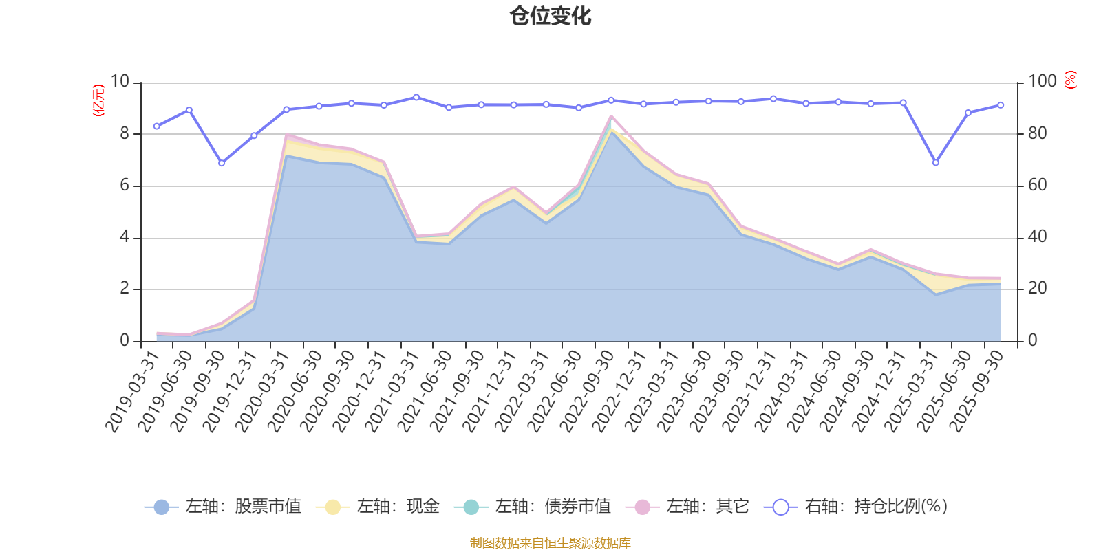 据定期报告数据统计,近三年平均股票仓位为90.01%,同类平均为72.35%。2021年一季度末基金达到94.3%的最高仓位,2019年三季度末最低,为68.87%。